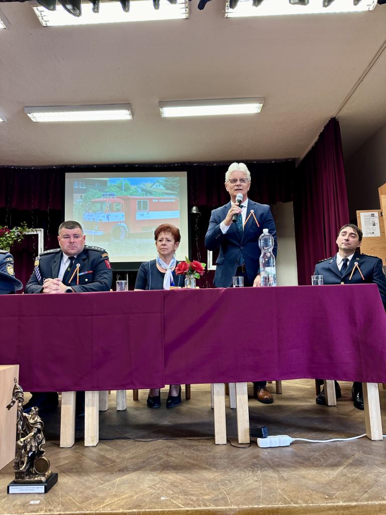Po slavnostní mši se průvod hasičských praporů vydal zpět do Obecního domu, kde od 11:30 proběhly zdravice - mimo jiné starosty hasičů okresu Opava p. Krusberského, místostarostky obce p. Janošové, starosty SDH Ludgeřovice p. Masného, který také setkání zahájil představením historie sboru a důležitých milníků, dále senátora p. Pavery a dalších pozvaných významných hostů ze Slovenska i Polska. Video zdravici zaslal také starosta obce p. Havlík, který se z pracovních důvodů nemohl dnešních oslav účastnit.