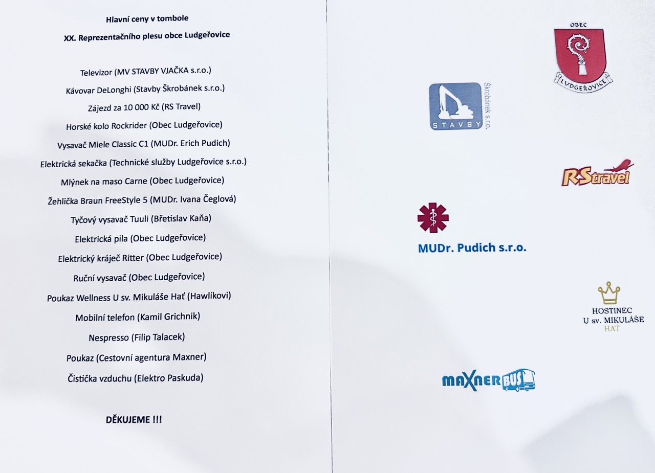 Tombola byla díky štědrosti sponzorů opravdu bohatá. Hlavním sponzorem byl pan Milan Vjačka - MV stavby Vjačka. Vřelé poděkování patří tedy všem sponzorům, a také všem organizátorům za přípravu skvělého večera. Děkujeme také obsluze restaurace a kuchařům za přípravu skvělého jídla! Medailonky z vepřové panenky i kachna byly skutečně mňamozní🙂