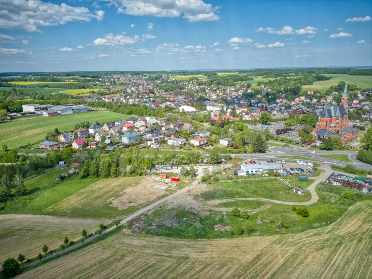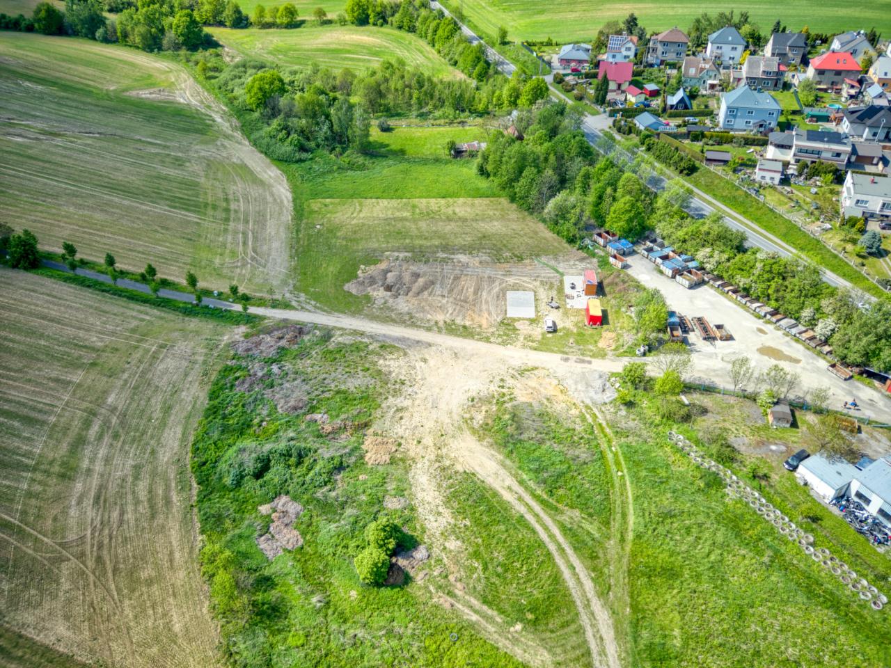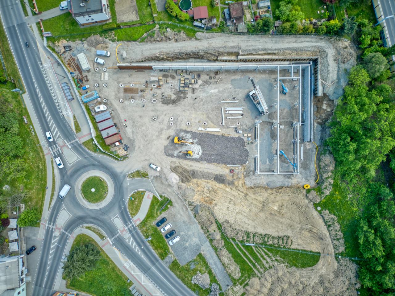 Pohledy na obec a okolí, stavbu Centra služeb a obchodu Hruška, z dronu - 1. května 2024