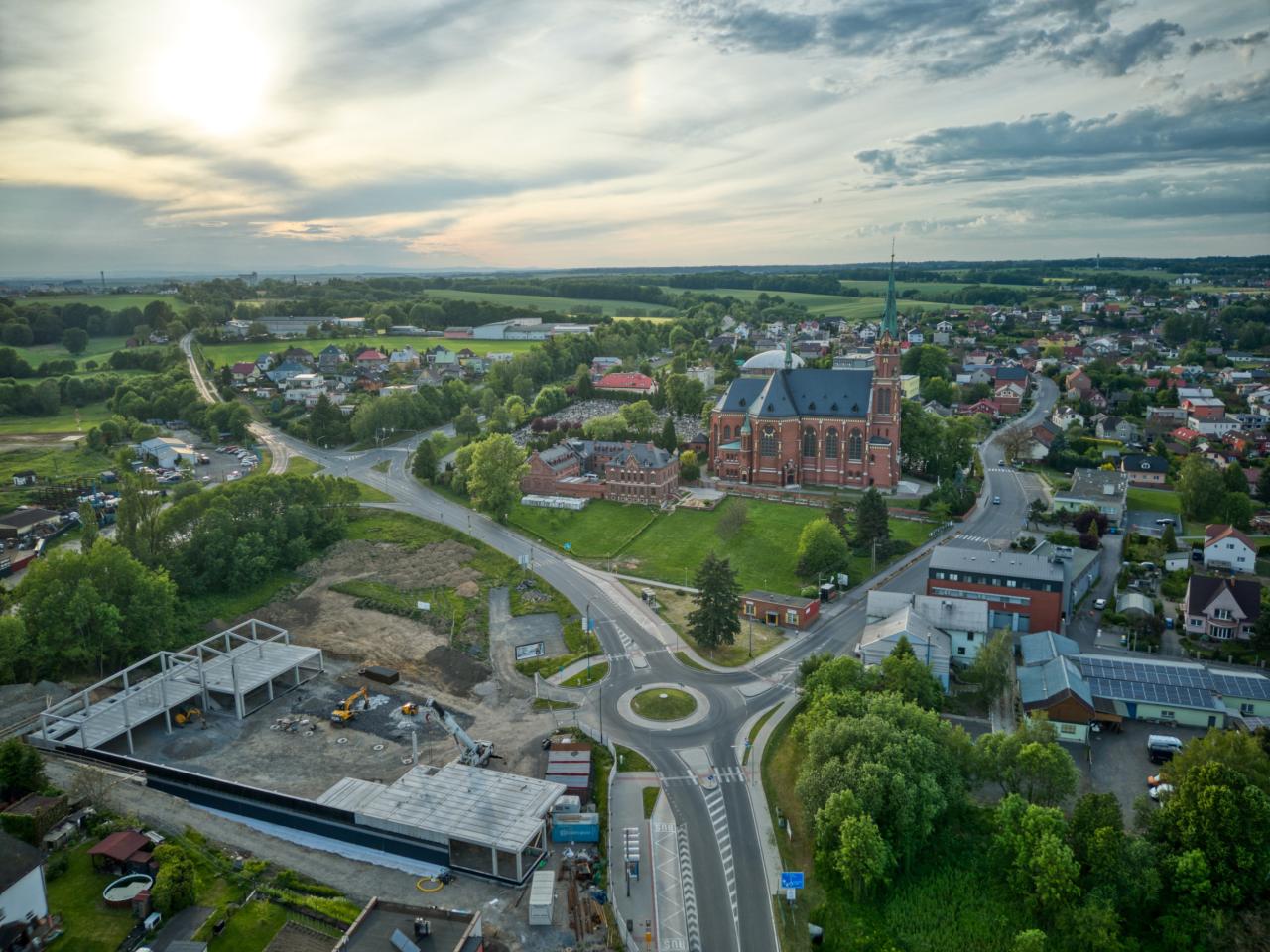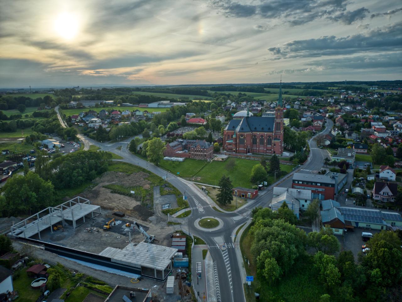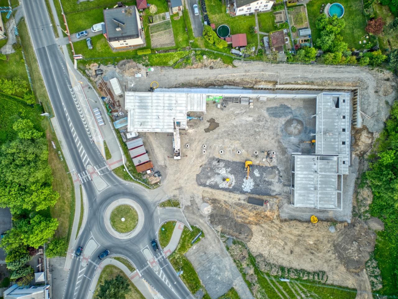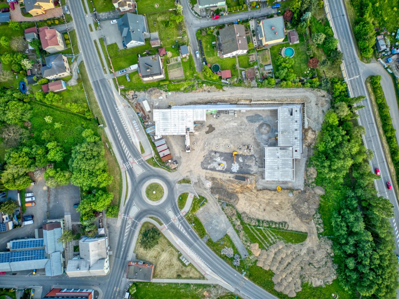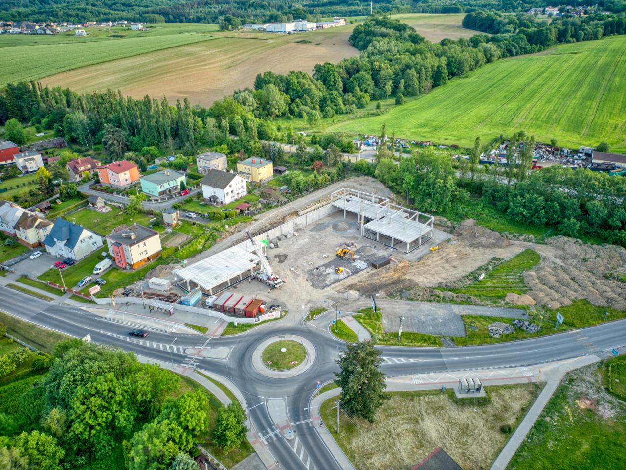 Pohledy na obec a okolí, stavbu Centra služeb a obchodu Hruška, z dronu - 16. května 2024