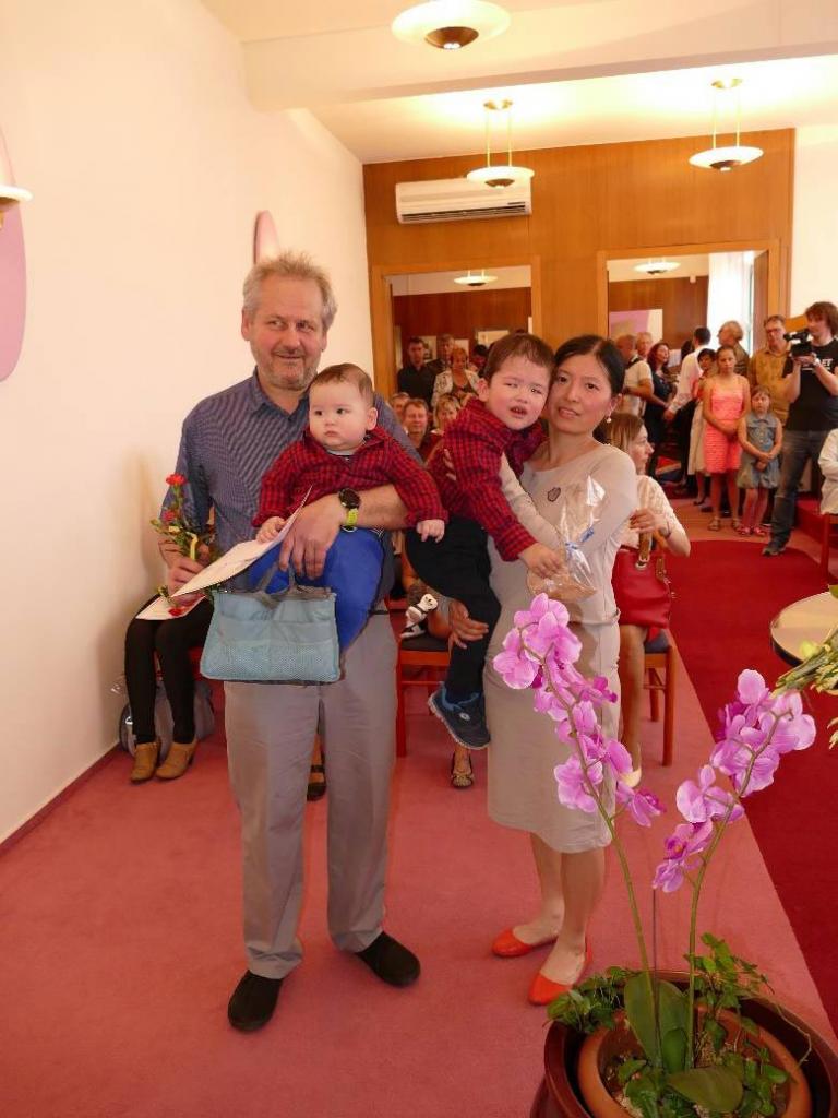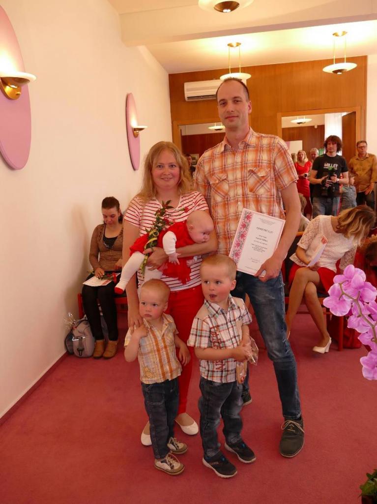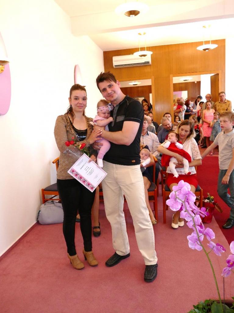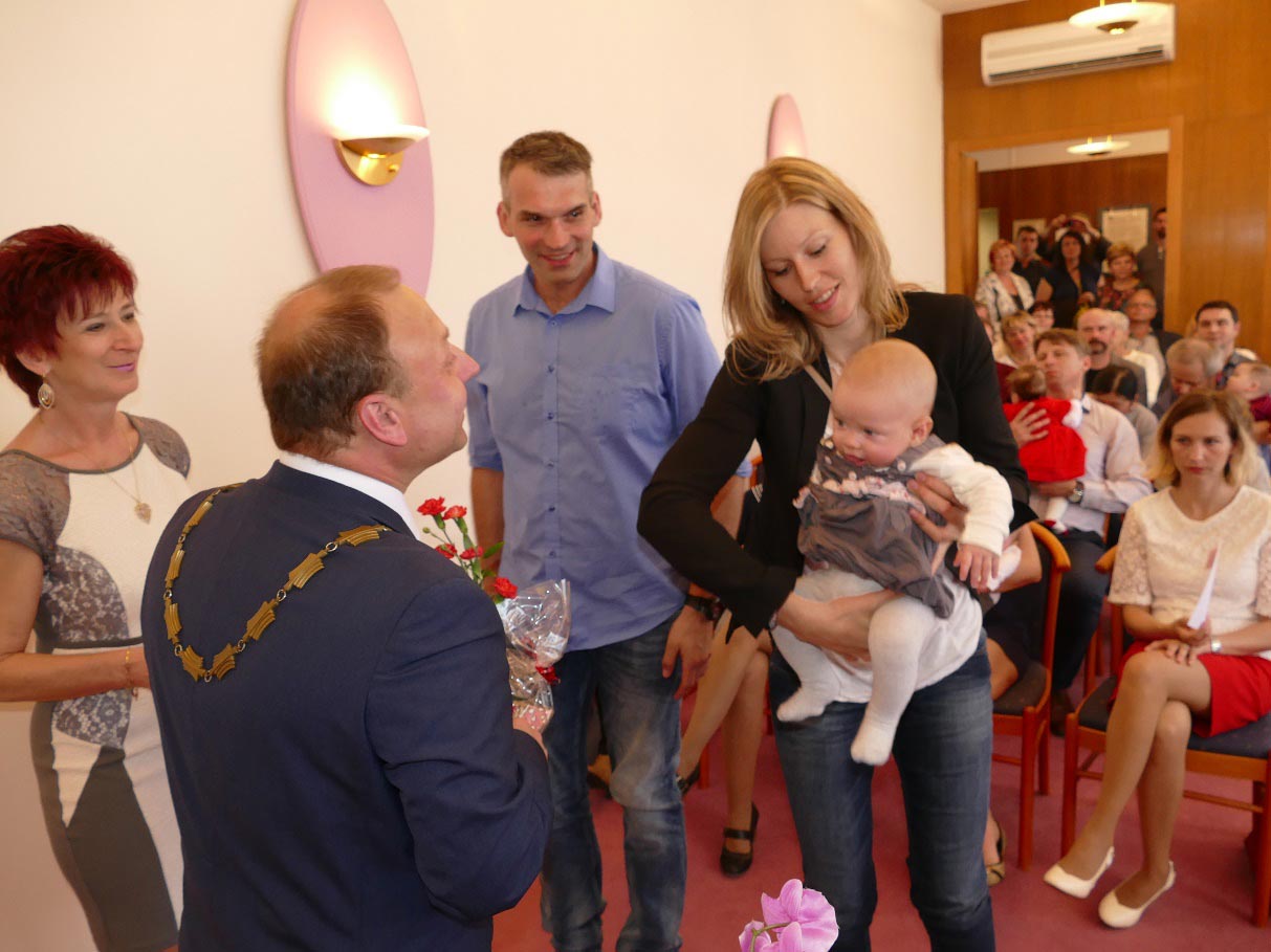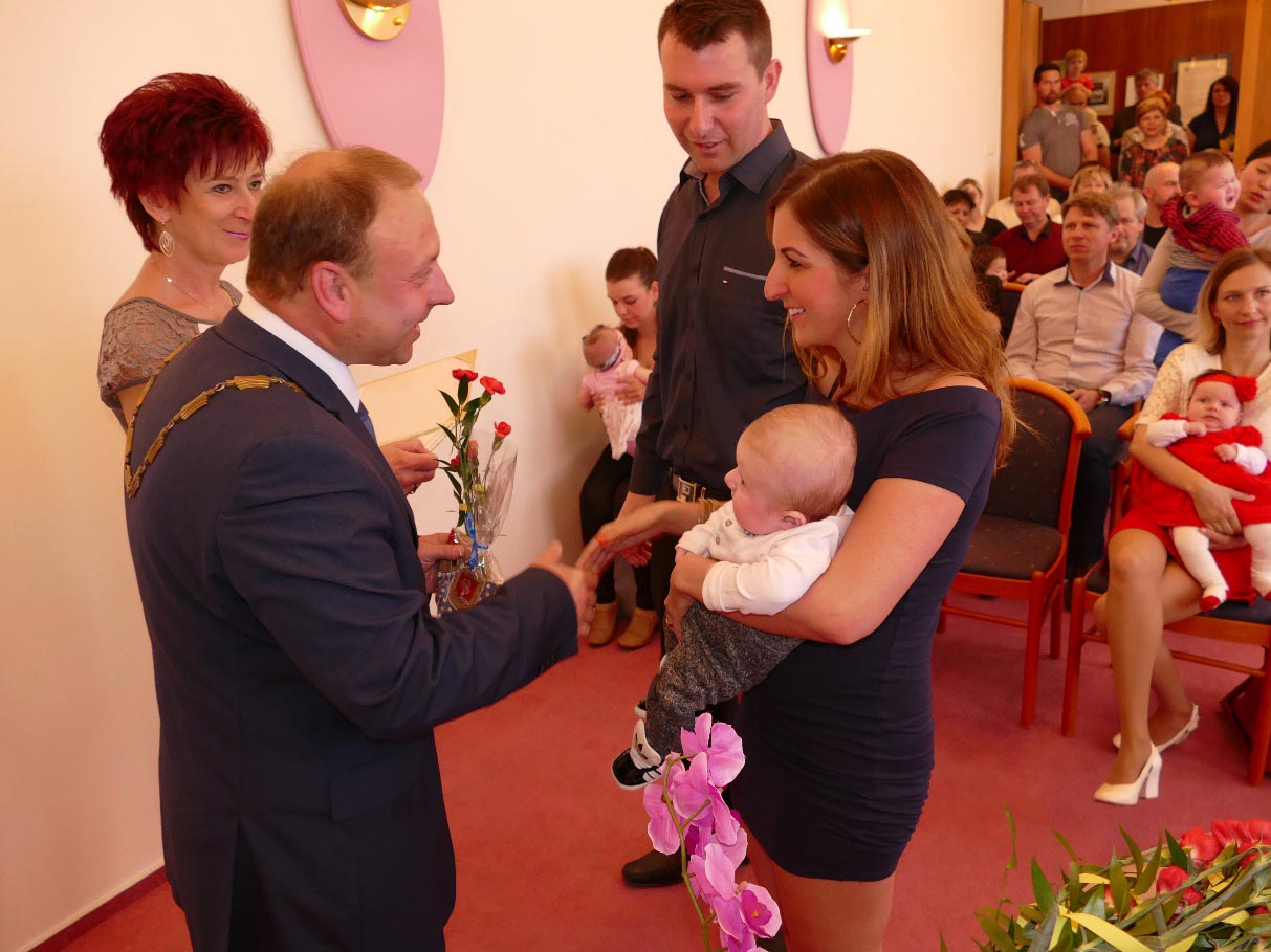 Po úvodním proslovu starosty od něj rodiče se svými vítanými dětmi přijali gratulaci, pamětní list, kytičku, dar obce 2000 Kč, zapsali se do pamětní knihy a společně na památku fotografovali.