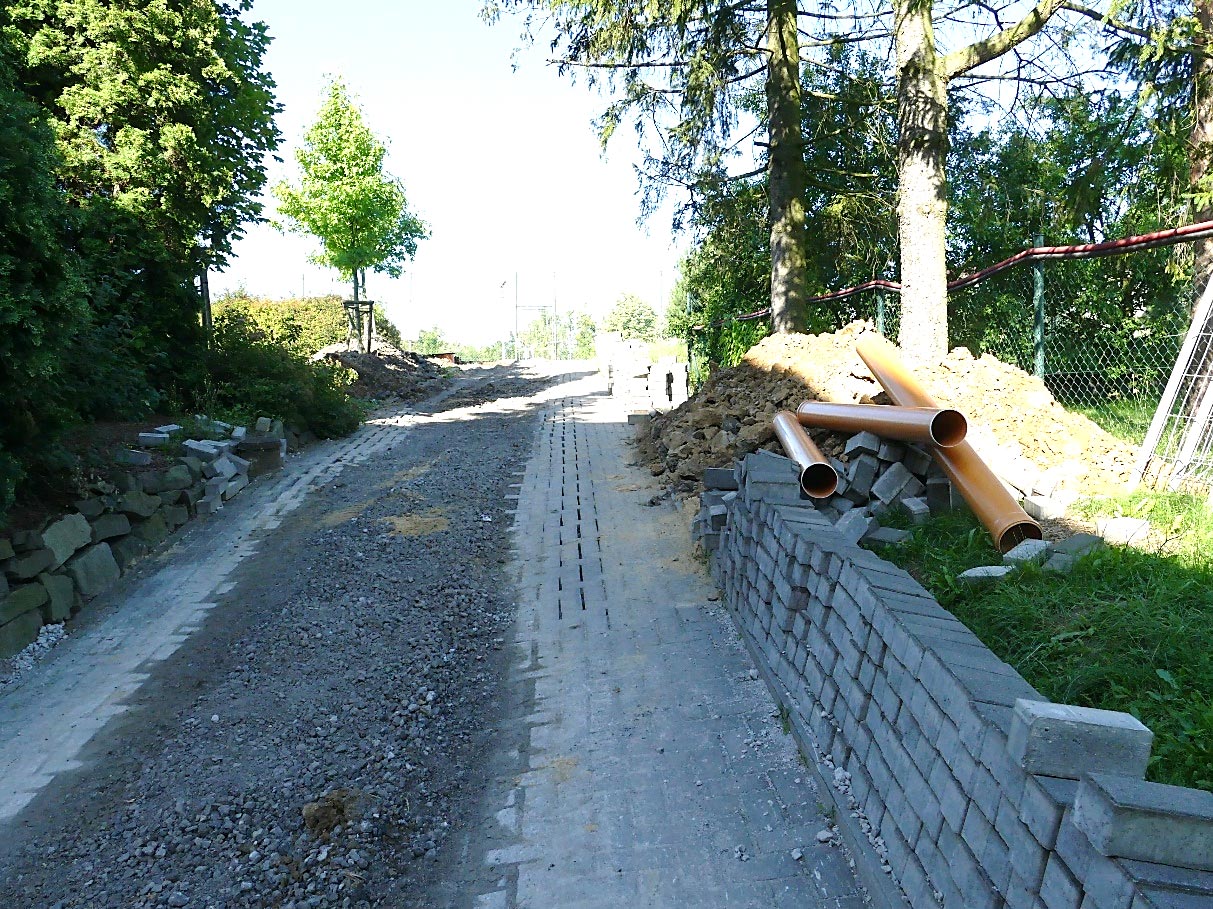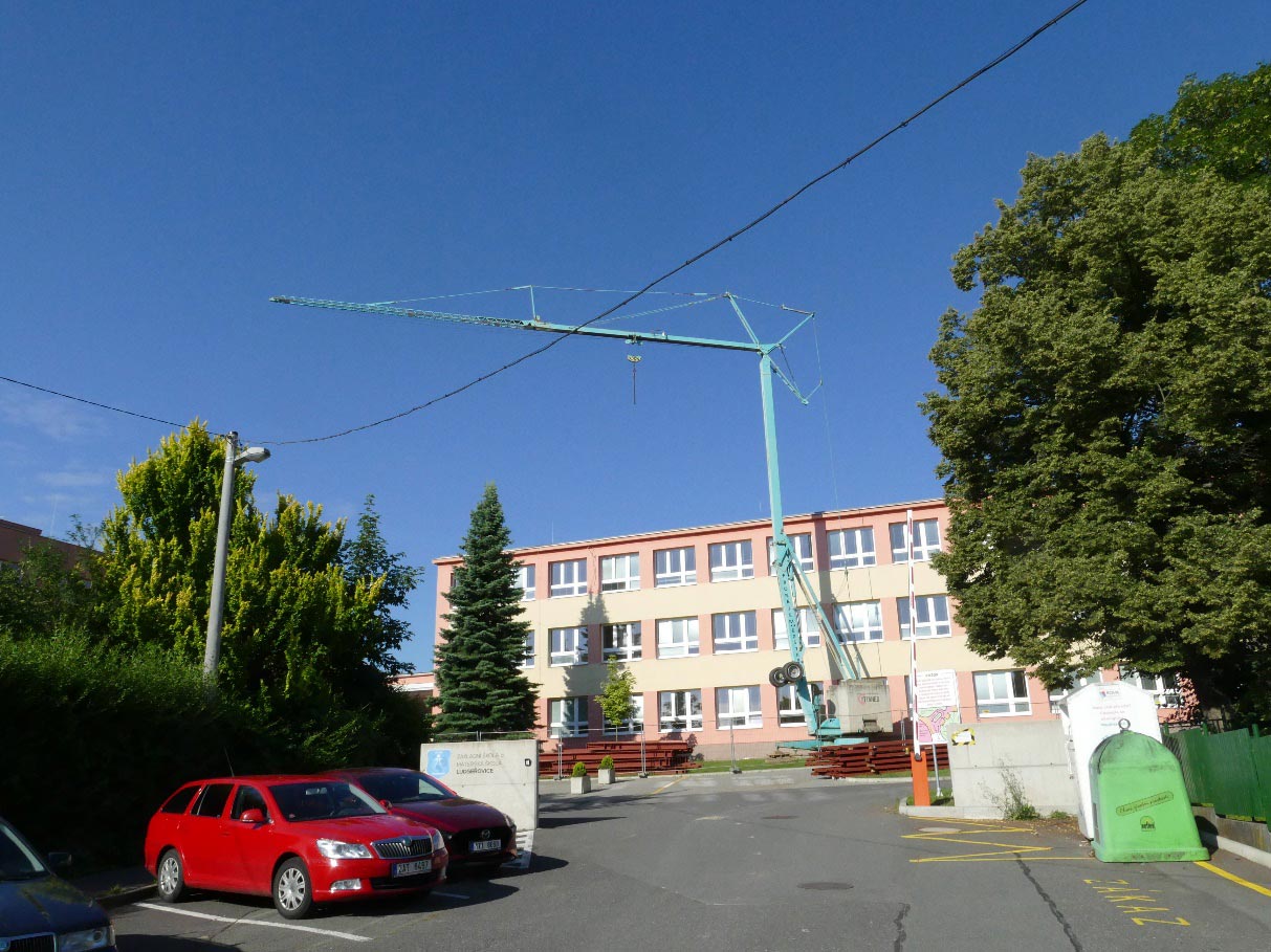 Už z dálky je vidět vysoký jeřáb, před budovou jsou složené materiály. Kus školního hřiště je rozkopán, je neprůchodný, jsou tam velké hromady vybagrované zeminy a dovezeného sypkého materiálu, vše pro stavbu nafukovací haly, která bude sloužit především jako tělocvična. Určitě se pilně pracuje i v budově, tam jsem nebyl. Celá stavba má být dokončena a předána k užívání tak, aby mohl v řádném termínu začít školní rok.