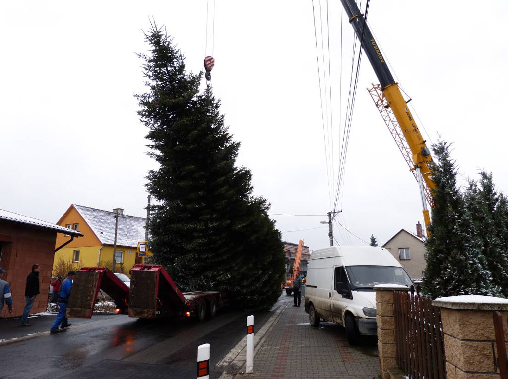 Kácení a převoz na Menšíkovou louku, kde bude obecní vánoční strom stát, se konaly 26.11.2013. Nebylo to jednoduché. Strom je vysoký asi 10m, průměr kmene u země je přes 40cm. Bylo nutné, aby po uřezání od země zůstal ve svislé poloze a byl tato nadzvednut až nad úroveň elektrického vedení. Také bylo nutné odpojit přívod elektřiny do budovy školky, procházela přímo korunou stromu. Musel být použit jeřáb s hodně dlouhým ramenem. Strom byl ve vrchní části uvázán k závěsu jeřábu, u země uřezán, ve svislé poloze vyzvednut a přemístěn nad přistavený automobilový přívěs a na ten postaven. Pak byl opatrně sklopen do vodorovné polohy. Vše hladce proběhlo během jedné hodiny. Ředitel školy spolu s učitelkami mateřské školy se pak nechali se stromem naposled vyfotografovat, pak už byl přes Rovniny a Hlučín převezen na Menšíkovu louku a tam postaven.