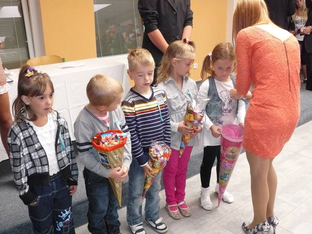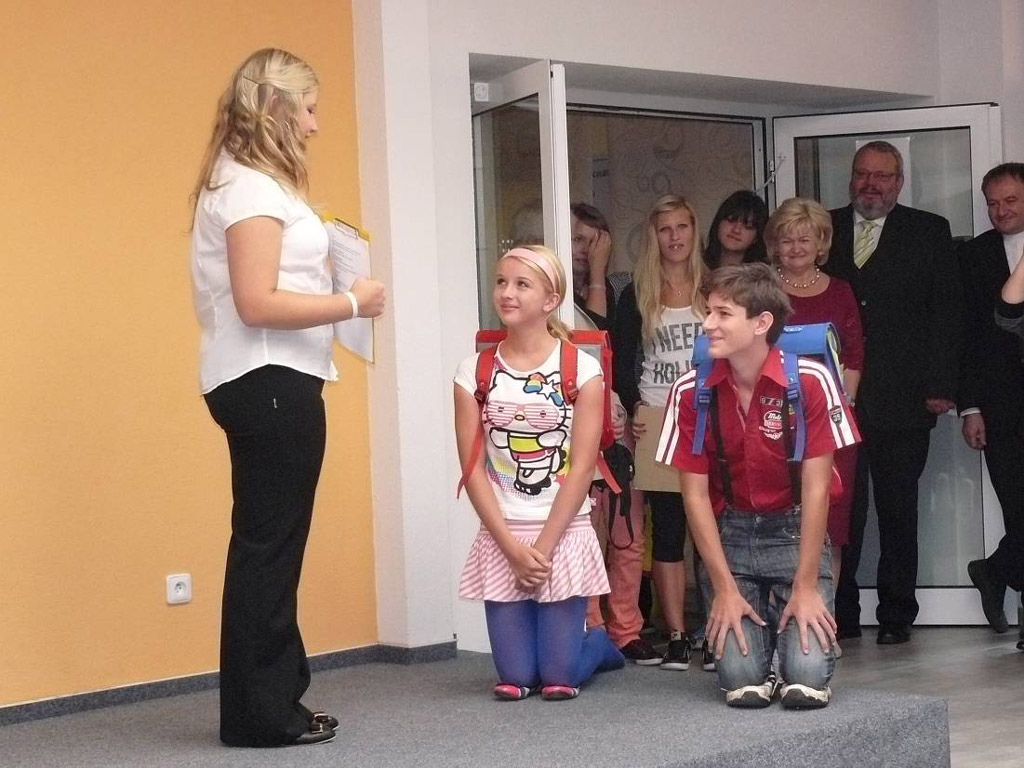 Podle tradice se pak v 9 hodin konalo ve vstupní hale vítání žáků prvních tříd. Jejich starší spolužáci jim na úvod připravili krátké veselé vystoupení o škole a dekorovali je stužkami s nápisem „Prvňáček 2013“. Přivítal je pak ředitel školy. Nakonec se prvňáčci se svými učitelkami poprvé podívali do svých tříd. Prvňáčci byli do školy přivítáni opravdu hezky.