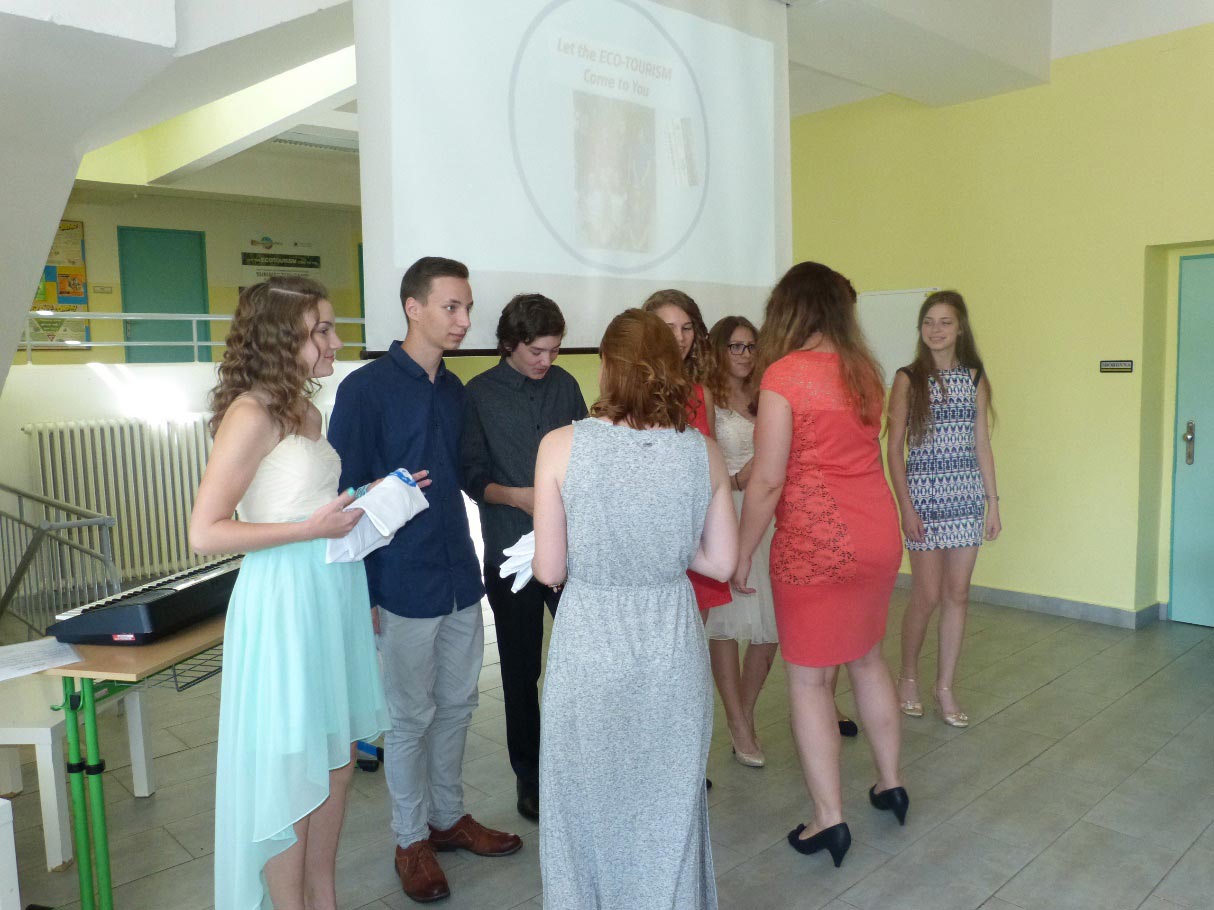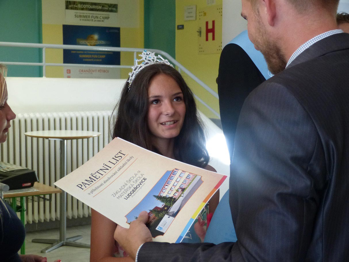 Pak žáci jednotlivě předstupovali, třídní učitel vždy řekl, do které školy k dalšímu studiu žák po prázdninách nastoupí, ozdobil ho šerpou a předal vysvědčení a pamětní list. Všichni dekorovaní žáci se pak postavili jako velký pěvecký sbor a zazpívali na ukončení své základní školní docházky o své základní škole slavnostní píseň a rozloučili se se svými třídními učiteli i s celou školou. Nakonec nechyběly gratulace a přání úspěšného nástupu do další etapy života od přítomných ředitelů škol, zástupců Ludgeřovic a Markvartovic a jáhna ludgeřovické farnosti. Byla to hezká a důstojná slavnost.
