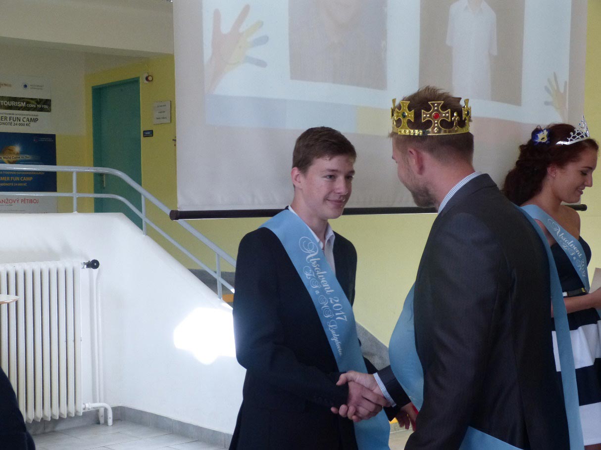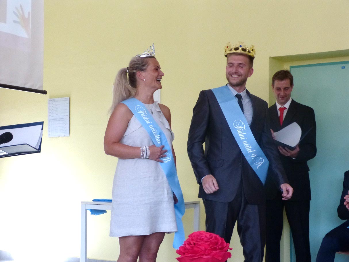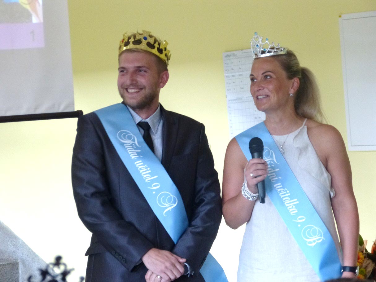 Po krátké přestávce nastoupili žáci devátých tříd, aby před zraky rodičů a známých převzali své poslední vysvědčení ze základní školy. Děvčata měla hlavy ozdobené korunkami. Připravili si pro tuto významnou příležitost velké vzpomínkové video, poděkovali svým třídním učitelkám, které měli v 1. až 5. třídě, třídní učitelce a třídnímu učiteli v 6. až 9. třídě. Třídním učitelkám nasadili na hlavu korunky, třídnímu učiteli korunu královskou.