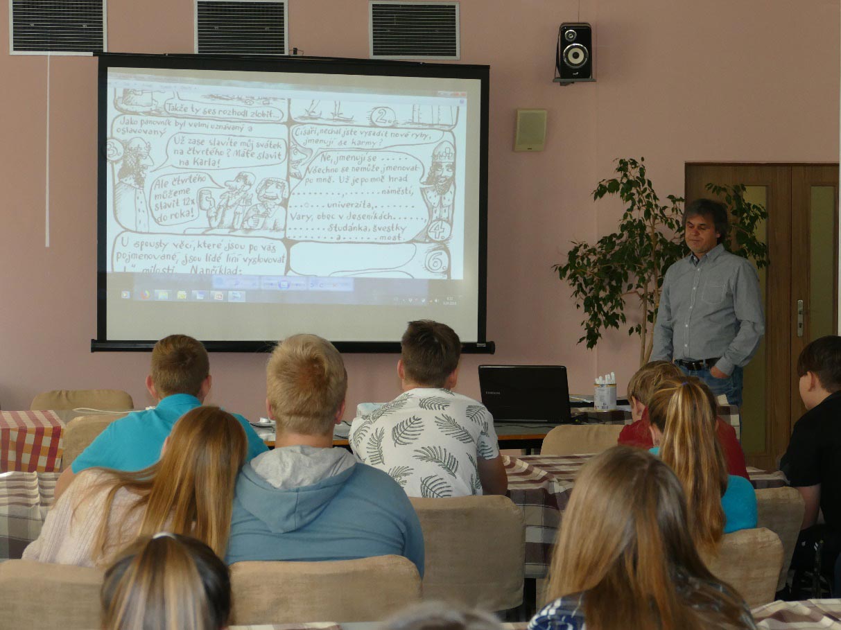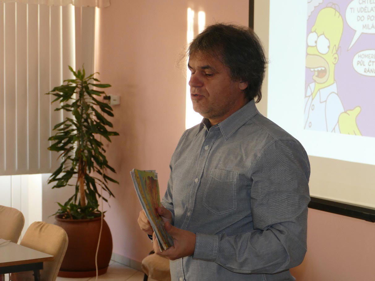 Workshop vedl známy autor komiksů Daniel Vydra. Nejdříve žákům stručně a velmi výstižně vysvětlil základní postupy a pravidla sestavování komiksů, ať už velmi stručných (vtipy, karikatury, reklamy) nebo celých komiksových knih s velkým počtem stran. Pak žákům rozdal kopie kresby s několika komiksovými obrázky a požádal je, aby do prázdných nakreslených bublin vymysleli vtipné texty, které by komiks dotvořily. Žáci se pak rozdělili do malých skupin a v každé skupině se snažili o svou verzi. Všechny to velmi bavilo. Nakonec každá skupina své dílko předvedla a bylo to veselé.