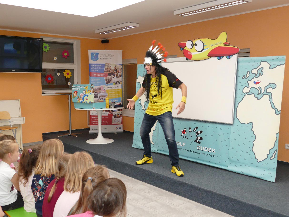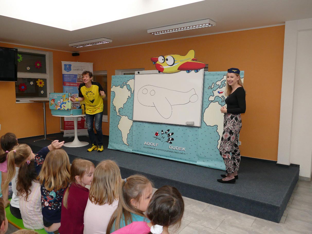 Organizovala obecní knihovna. Účastnily se děti ze všech tří prvních tříd ludgeřovické školy i se svými učitelkami. Adolf Dudek dětem rozumí. Už ilustroval dlouhou řadu dětských časopisů a knížek, zejména pohádkových. Je nejúspěšnějším současným ilustrátorem, prodaly se už více než 3 miliony jím ilustrovaných knih. Pravidelně s dětmi beseduje po celé republice, v Ludgeřovicích už mnohokrát. Jeho ilustrace se dětem moc líbí. Do svého veselého besedování zatáhnul všechny přítomné děti i učitelky. Některé spolu s ním kreslily na tabuli a přitom si jen tak mimochodem opakovaly anglická slovíčka, protože malíř střídal češtinu a angličtinu. Dětem to žádné problémy nedělalo. Tak veselé vyučování se moc líbilo i učitelkám.