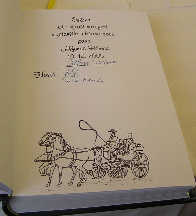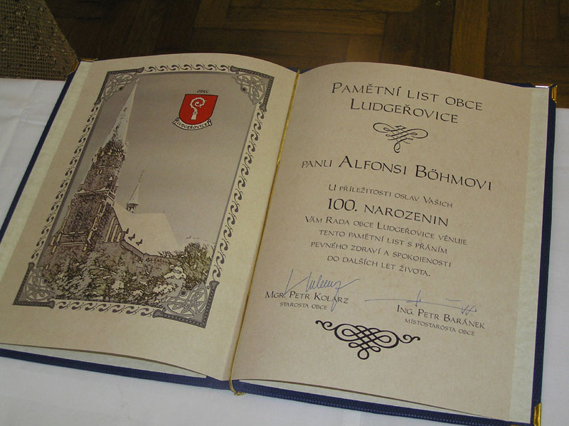 V sobotu 10. prosince se v Obecním domě konala na počest stoletých narozenin pana Alfonse Böhma slavnost. Kromě rodiny a známých mu tam blahopřáli starosta pan Mgr. Petr Kolarz, obecní rada, zástupci úřadu sociálního zabezpečení. Zatancovaly a gratulovaly mu i děti z ludgeřovické mateřské školky. Oslavenec se podepsal do obecní kroniky.