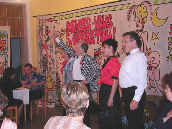 Poté p.starosta,místostarosta ing. Baránek a člen rady ing. Hofrichter popřáli všem hostům z řad seniorů a předali jim kytičky. Večer zpestřilo divadelní představení herců z opavského divadla pod vedením p.Smolky, kteří účastníkům slavnostního setkání zazpívali krásné operetní melodie . Po večeři pak následovala volná zábava, ke které nám zahrál ing. Karel Višnický.