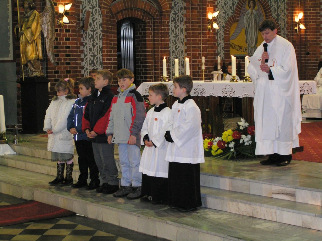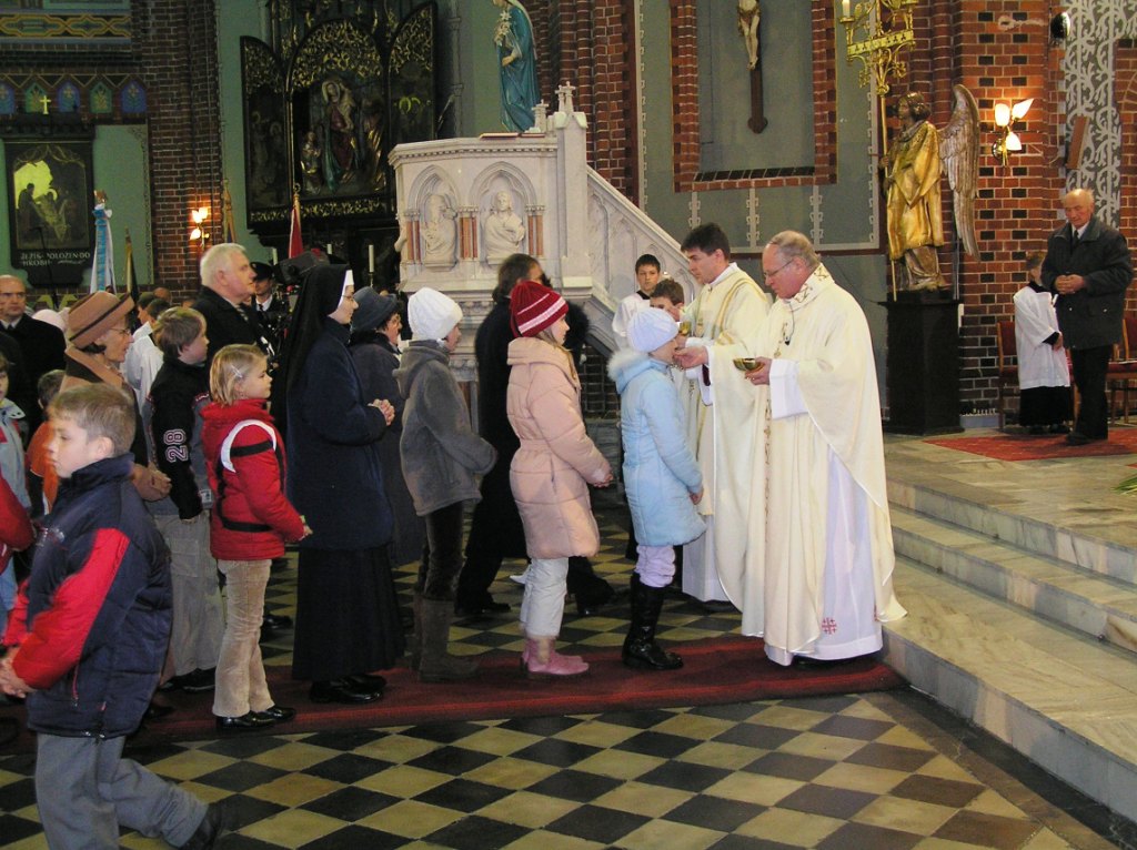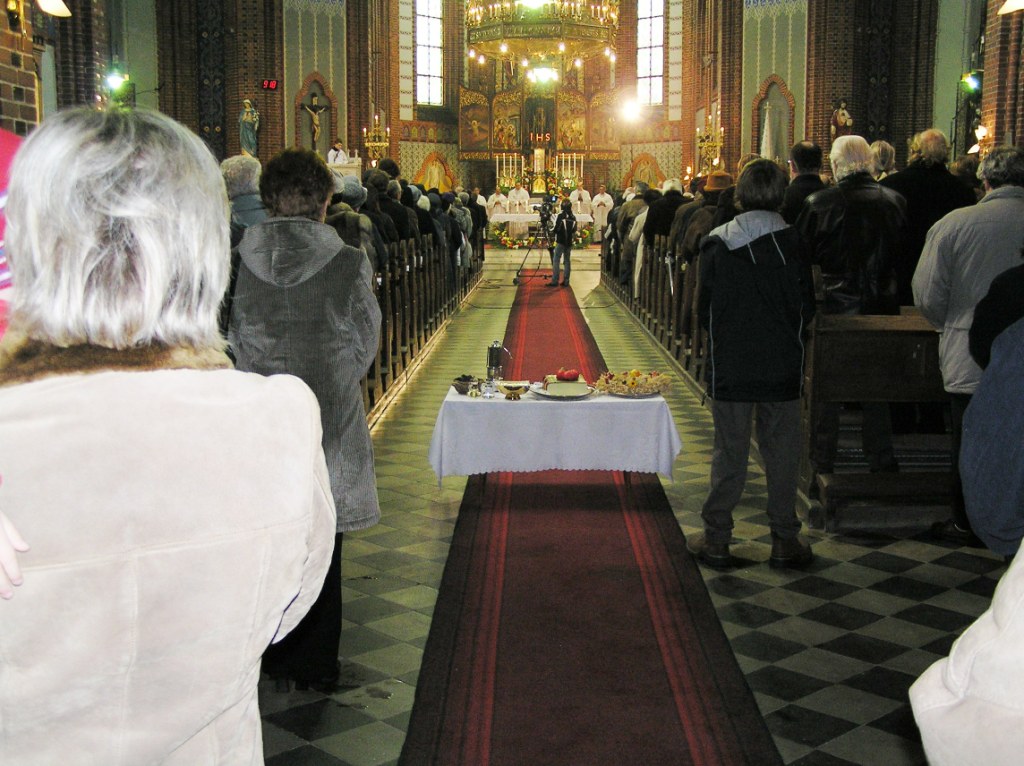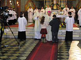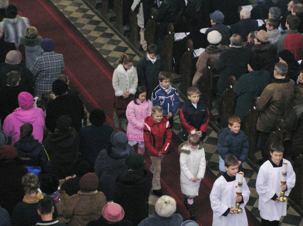 Děti z obcí farnosti (z Ludgeřovic, Markvartovic. Petřkovic) přinášejí symbolické obětní dary. Slavnostní mši svatou přenášela televize NOE.