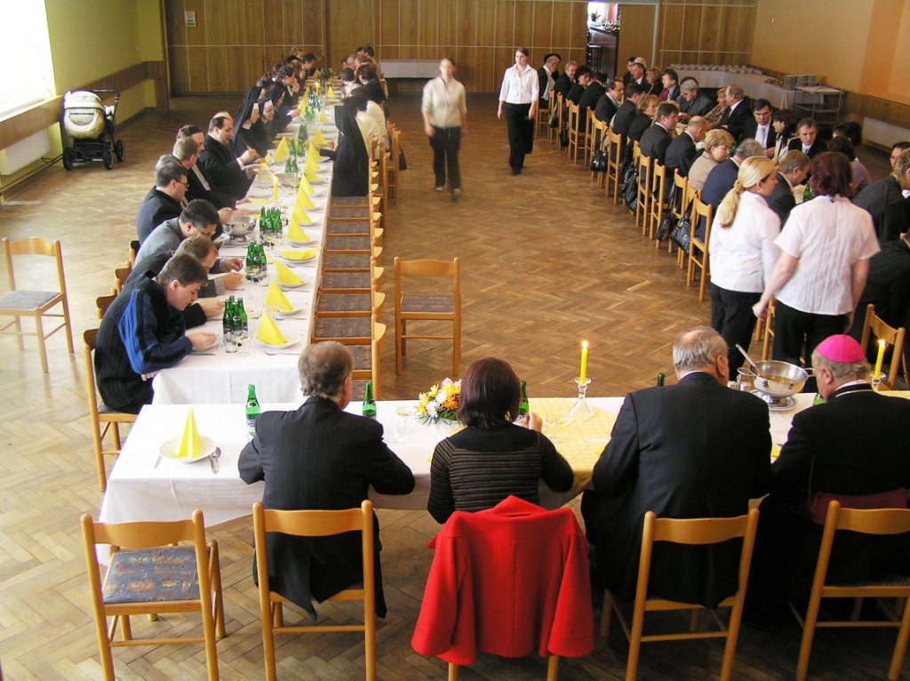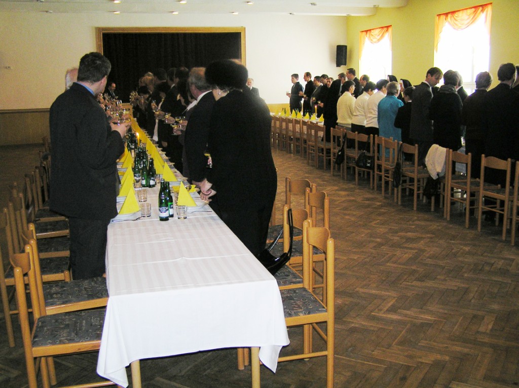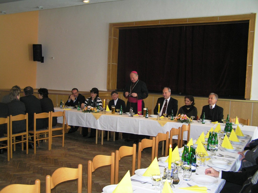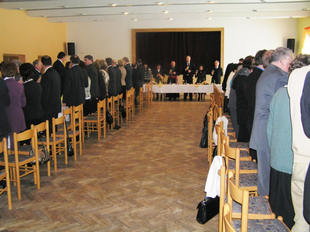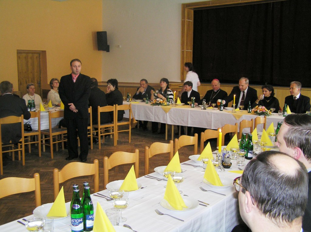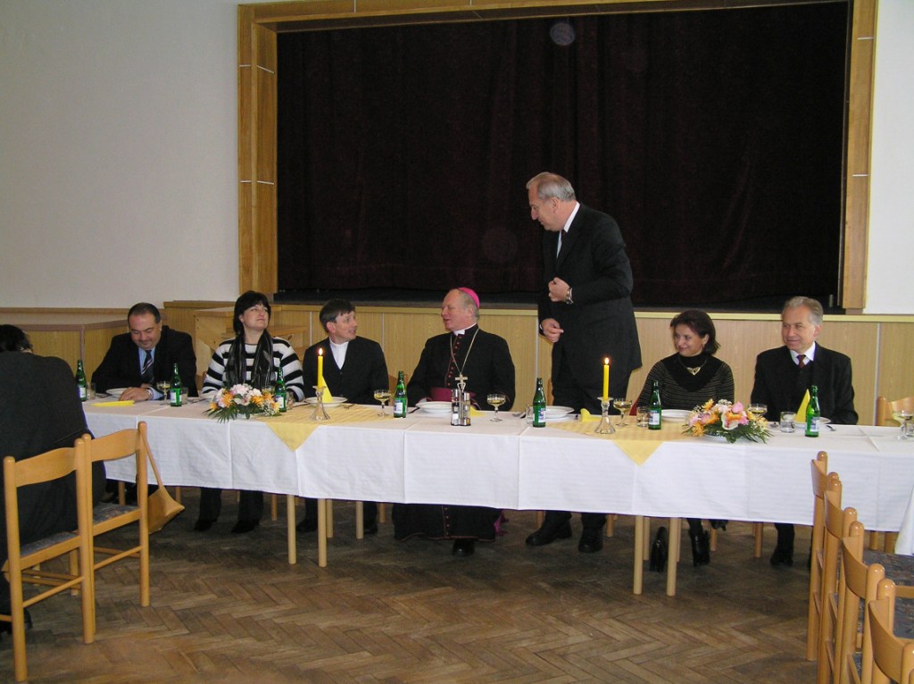 Po mši svaté se v sále Obecního domu konalo setkání kněží s čestnými hosty a s organizátory slavnosti. Na obrázku přeje hejtman Moravskoslezského kraje Ing. Evžen Tošenovský našemu chrámu, aby byl chloubou Ludgeřovic a celého kraje i ve druhém století své existence.