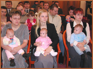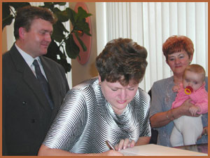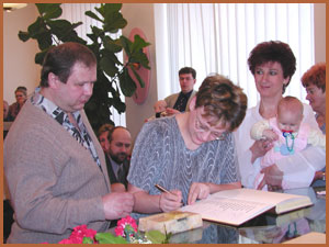 Po projevu Mgr.Piprekové vyzvala matrikářka, paní Gabriela Kupcová rodiče, aby potvrdili svým podpisem do pamětní knihy obce Ludgeřovice svou účast na dnešním setkání. Rovněž připomněla, že po ukončení slavnostního ceremoniálu bude předán rodičům finanční dar od obce Ludgeřovice ve výši 2.000,- Kč. Rodiče byli postupně zváni k podpisu do pamětní knihy obce Ludgeřovice a poté přijímali kytičku a gratulaci z rukou Mgr. Piprekové. Gratulace probíhaly velmi srdečně, neboť to bylo převážně setkání učitelky se svými bývalými žáky, dnes v roli rodičů.
