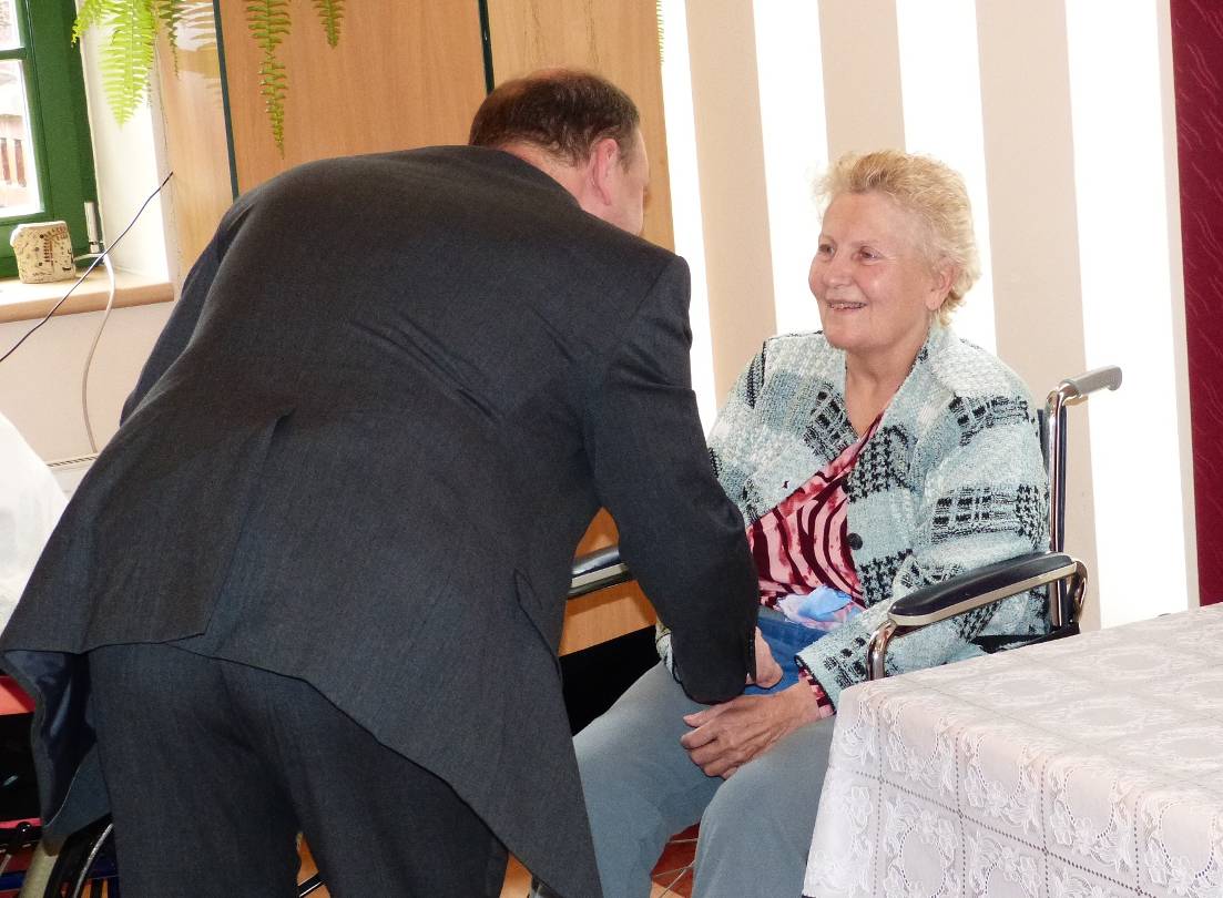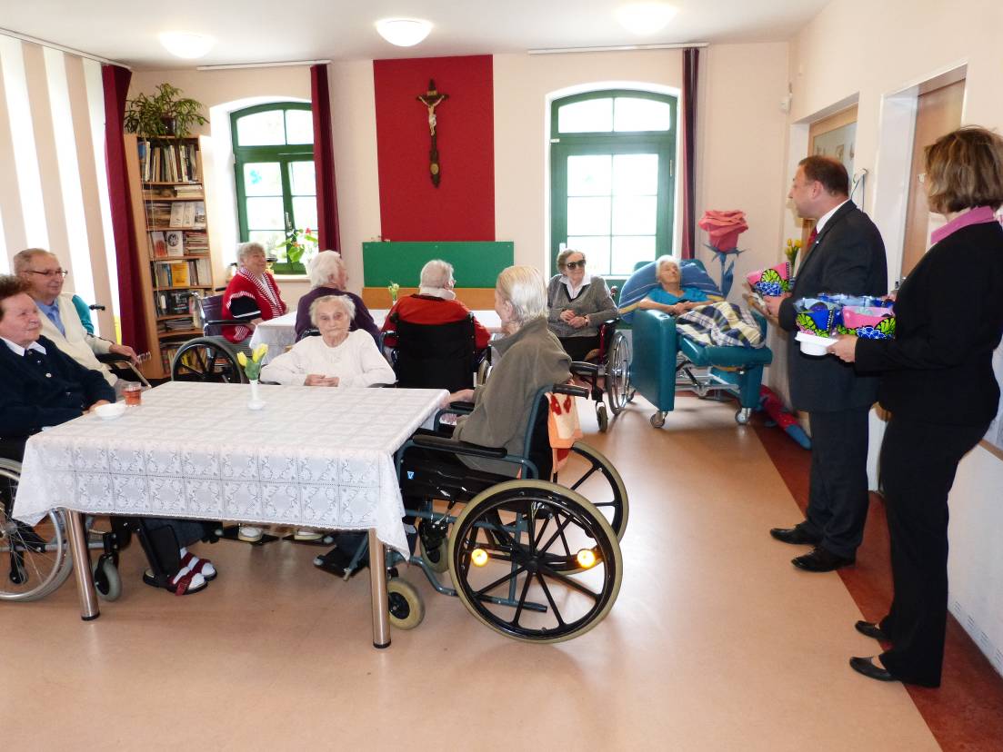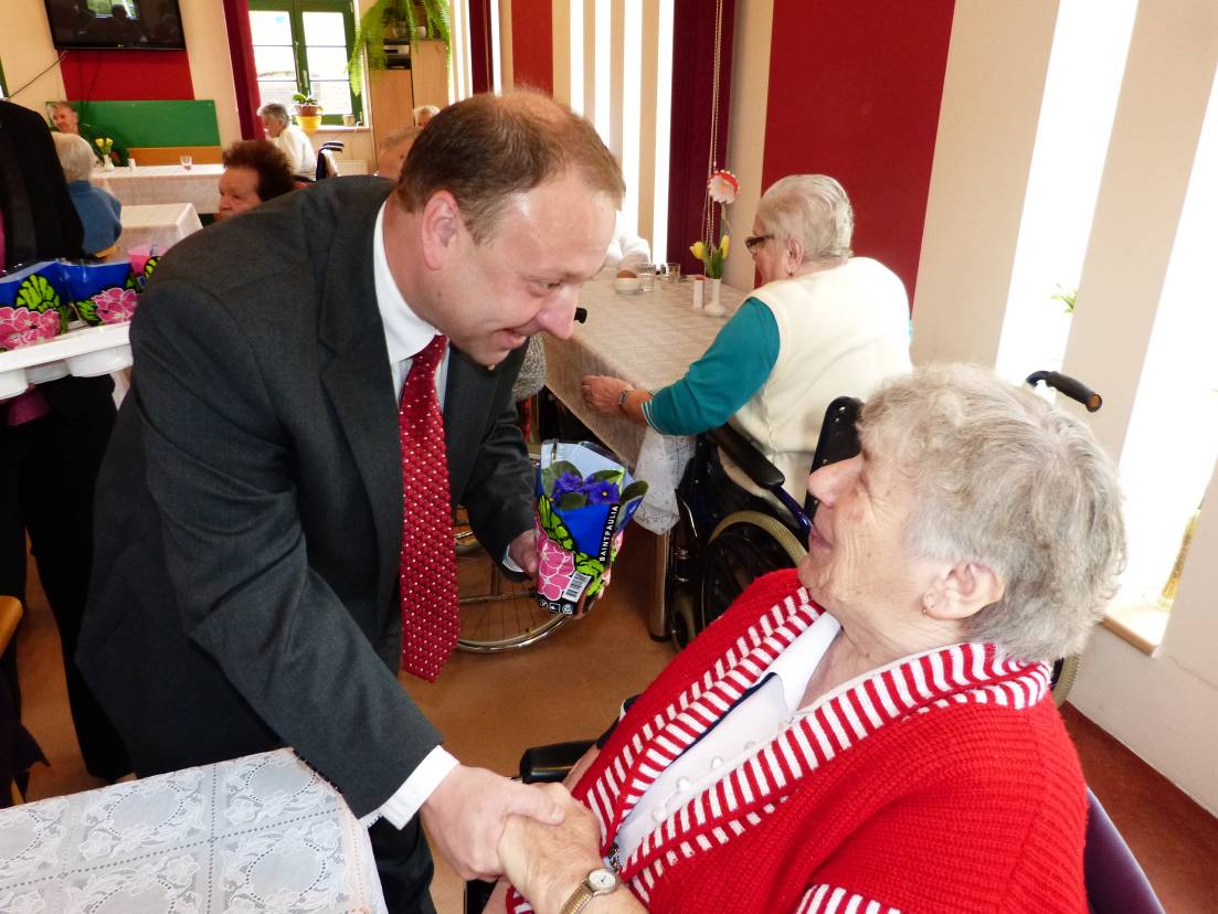 Klientkám domova přišel 9.5.2014 gratulovat starosta obce Mgr. Daniel Havlík. Každé popřál, předal květinu a se všemi dohromady pobesedoval. Byla to pro všechny příjemná hodinka.
