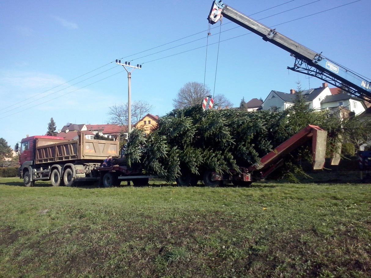 Už třetím rokem pokračuje v naší obci tato nově založená tradice. Letošní strom, krásný pravidelně rostlý smrk, věnoval pan Petr Kučera, Na Návsi 235/98. Rostl na zahradě u jeho domu, která končí na hranici s pozemkem hřiště TJ. Skácení, převezení na Menšíkovou louku, postavení a vyzdobení organizovali pracovníci místních Technických služeb. Kácení 23.11. fotografoval pan Josef Balgar.