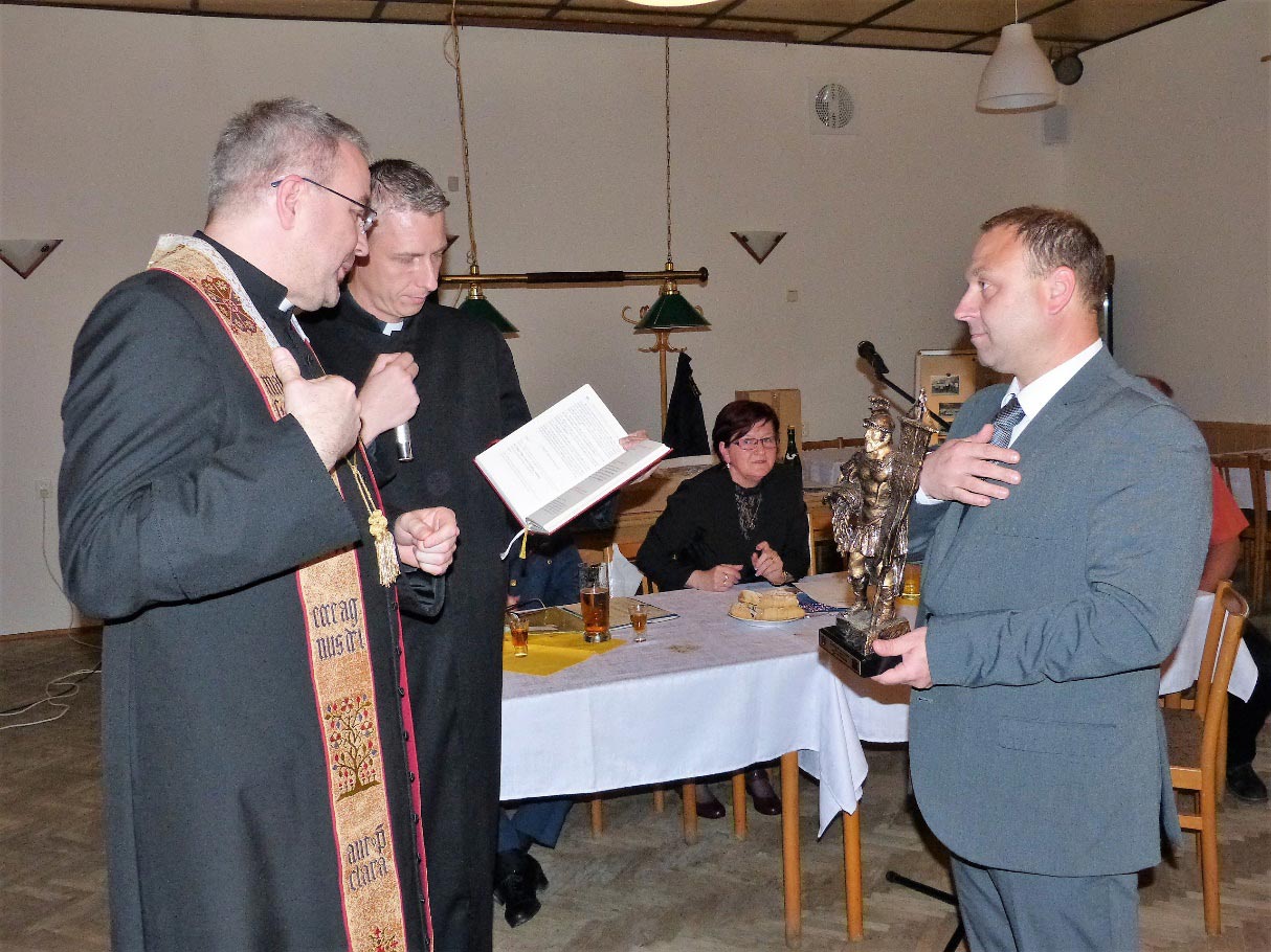 Starosta obce přinesl dar a to sošku patrona hasičů sv. Floriana, kterou přítomní kněží slavnostně posvětili.