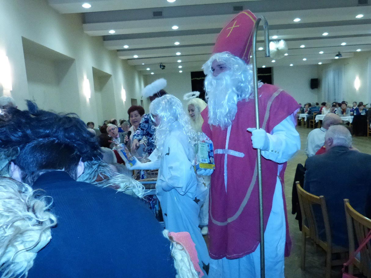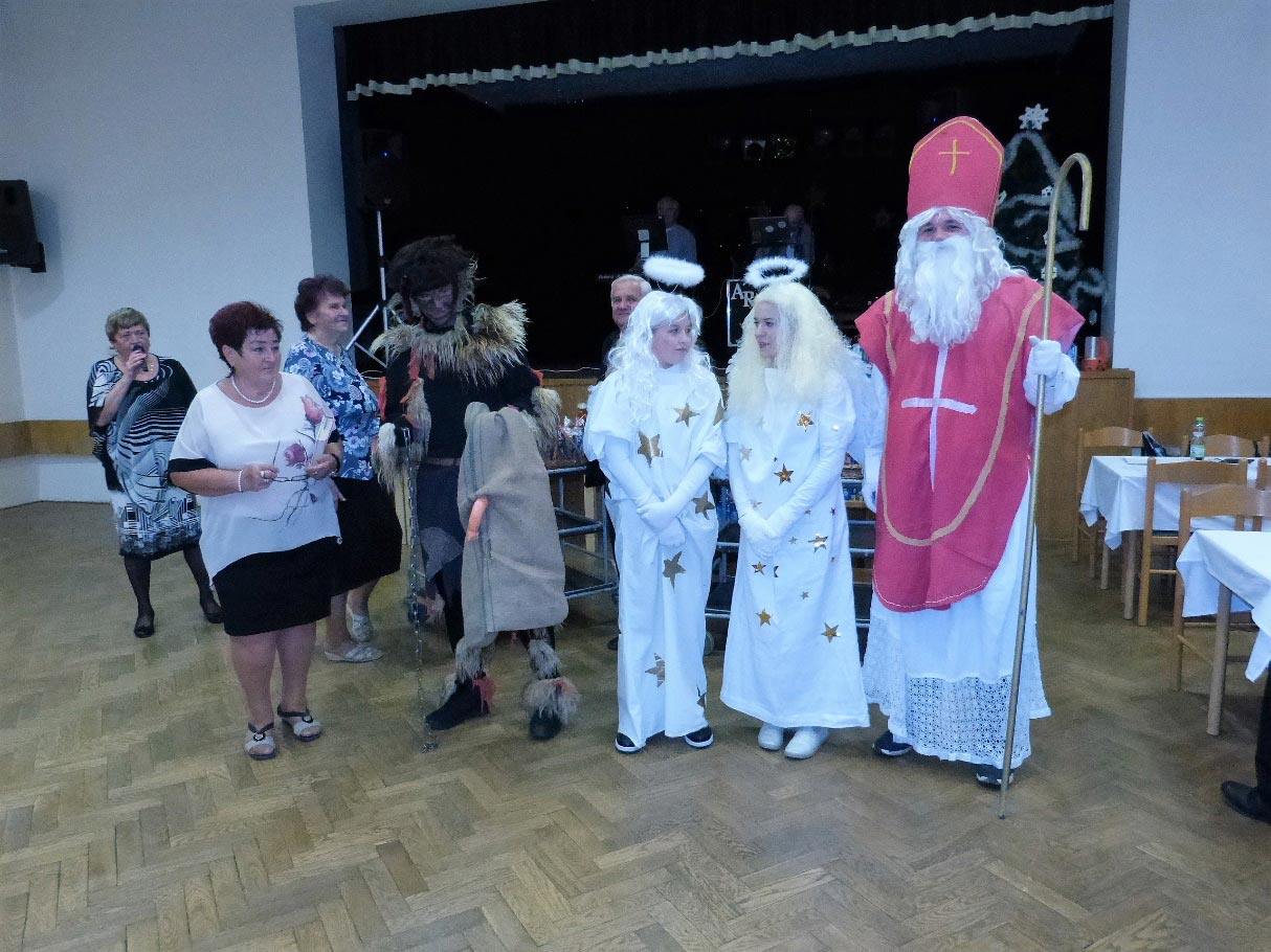 Konal se v Obecním domě 9.12.2017. V sále bylo kolem 150 členů klubu. Čekání na Mikuláše si zpestřovali dobrotami ze svépomocného bufetu a také hudbou, poslechem i tancem, hrála jim skupina ARENA z Vrablovce. V 18 hodin přišel Mikuláš s doprovodem dvou krásných andělíčků a jednoho ošklivého čerta. Čert se sice snažil strašit, ale senioři se jaksi nebáli. Andělíčci rozdávali dárkové balíčky připravené výborem klubu. Po necelé půlhodině už měl v sále každý svůj mikulášský dárek, Mikuláš a členové jeho družiny naposled důchodcům zamávali a odešli na další štaci. Večer pokračoval dobrou večeří z restaurace pana Myslivce, pak se pilně tancovalo. Domů se účastníci rozcházeli po 21. hodině.