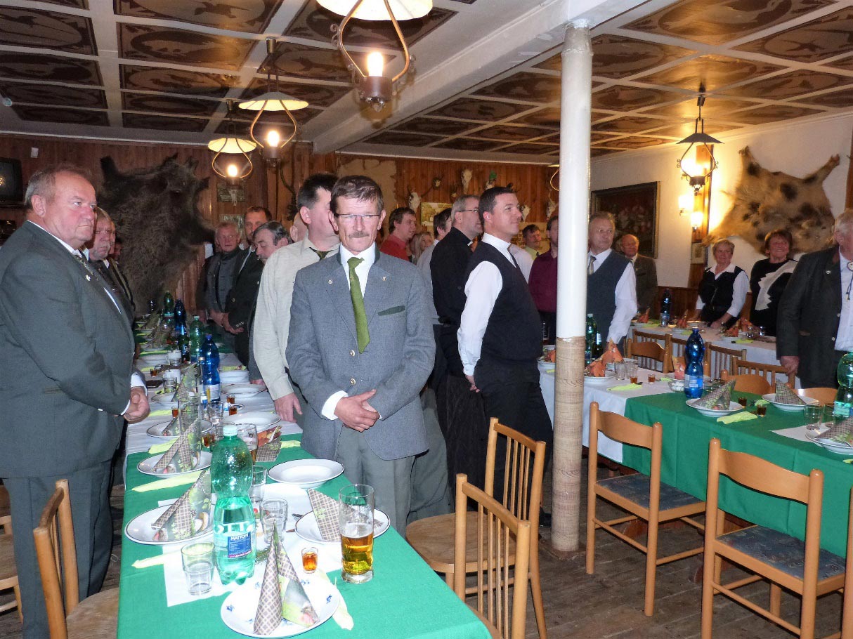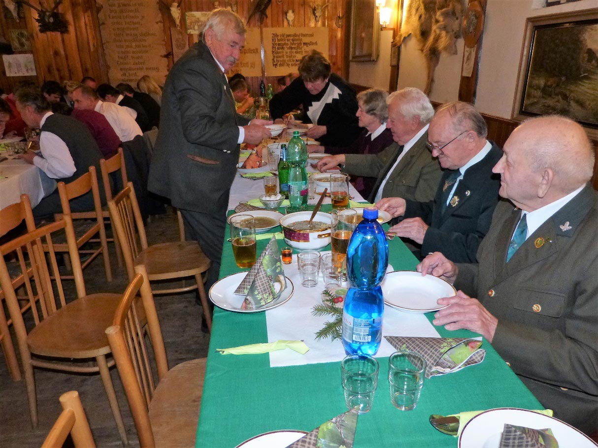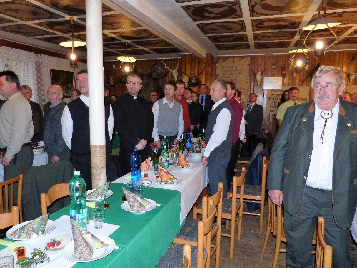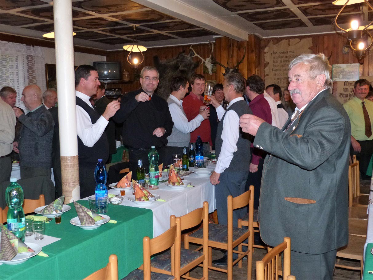 Po mši svaté se konalo setkání v chatě Ostříž se slavnostním obědem. Podávala se výborná daňčí pečeně. Vzpomínalo se na ty, kteří už nejsou mezi námi. Hodnotila se současná situace mysliveckého spolku Ostříž, kterému už řadu let chybí vlastní honitba. Členové se dostanou s flintou do lesa jedině, když jsou pozvání držitelem některé honitby v okolí. Za tohoto stavu není jednoduché získávat nové mladé členy.
