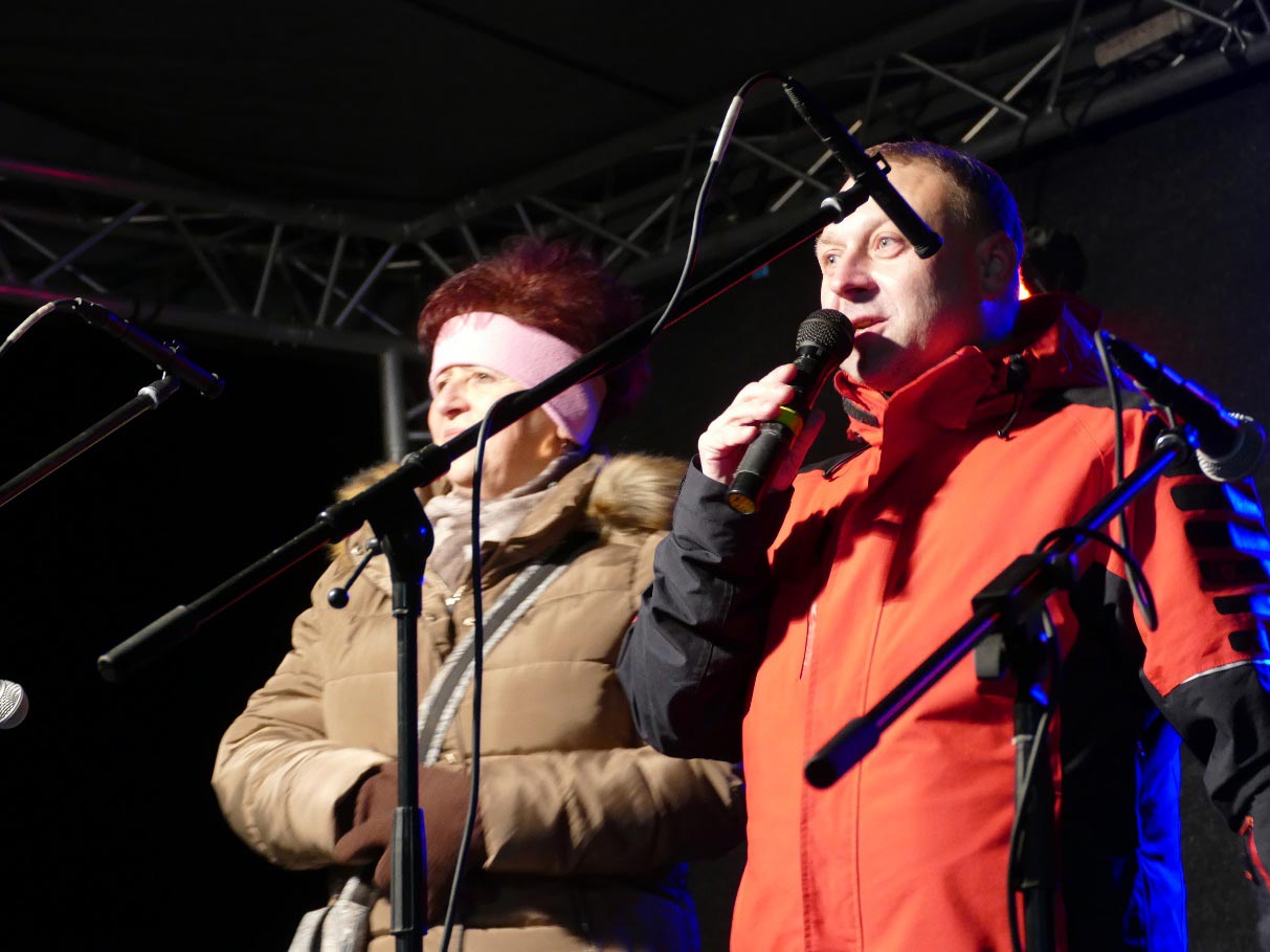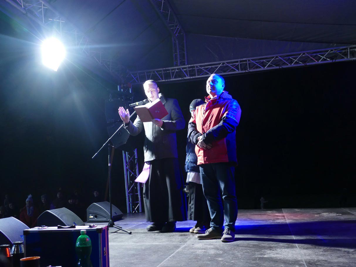 V 17.30 všechny přivítali starosta obce Daniel Havlík a místostarostka Alena Janošová. Publikum s velkým povděkem přijalo pokyn pana starosty stánkařům, aby začali kvůli velké zimě v předstihu podávat horký svařák, se kterým se původně počítalo až po rozsvícení vánočního stromu. Pan starosta také poděkoval dárcům stromu manželům Tománkovým a všem, kteří se na přípravě akce podíleli, zejména místním dobrovolným hasičům, ti celý areál pro konání slavnosti připravili a účastnili se stánkového prodeje, firmě Škrobánek, která strom skácela, převezla a postavila na Menšíkové louce a také zaměstnancům Technických služeb Ludgeřovice, kteří pomáhali. Několik minut před 18. hodinou se dostavil jáhen Zdeněk Uher, aby vánoční strom před rozsvícením požehnal. Omluvil pana faráře Václava Koloničného, který pro silné nachlazení nemohl přijít. Promluvil také pan Aleš Tománek (varhaník), z Vrablovce, jehož rodiče obci vánoční strom z jejich zahrady darovali, a který on jako čtrnáctiletý zasadil. Jáhen Zdeněk Uher pokračoval krátkým sympatickým proslovem na téma vánoc a modlitbou. Pak už se se starostou odebrali k vánočnímu stromu, který byl pokropen svěcenou vodou a rozsvícen. Vypadá nádherně. Družná zábava pak ještě dost dlouho pokračovala, než se publikum postupně rozešlo domů. Byl to hezký sváteční večer.
