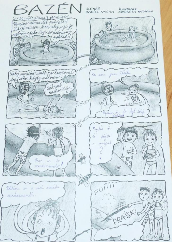 Pořádaný workshop o komiksech byl tentokrát pro žáky devátých tříd. Vedl ho zkušený lektor těchto akcí pan David Vydra. Má za sebou už několik set takových workshopů, jejich náplň vždy přizpůsobuje věku žáků. Na začátku jim stručně vysvětlí základní pravidla tvorby komiksů. Pak se účastníci rozdělí do malých skupin a snaží se už hotový jednostránkový komiks přepracovat podle vlastních nápadů a fantazie. Jednotlivé skupiny nakonec své výtvory představí ostatním a všichni o nich diskutují. Je to maximum, které se dá za půldruhé hodiny stihnout. Byla to užitečná akce, určitě přispěla k lepšímu chápání pravidel dobrých komiksů a snad i podnítila některé účastníky k pokusům uplatnit svou fantazii a případně dát dohromady tvůrčí komiksový tým.