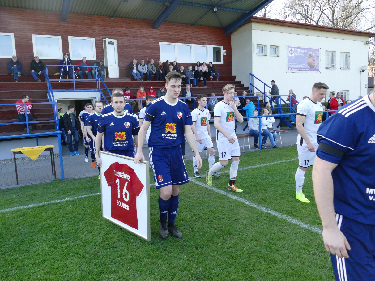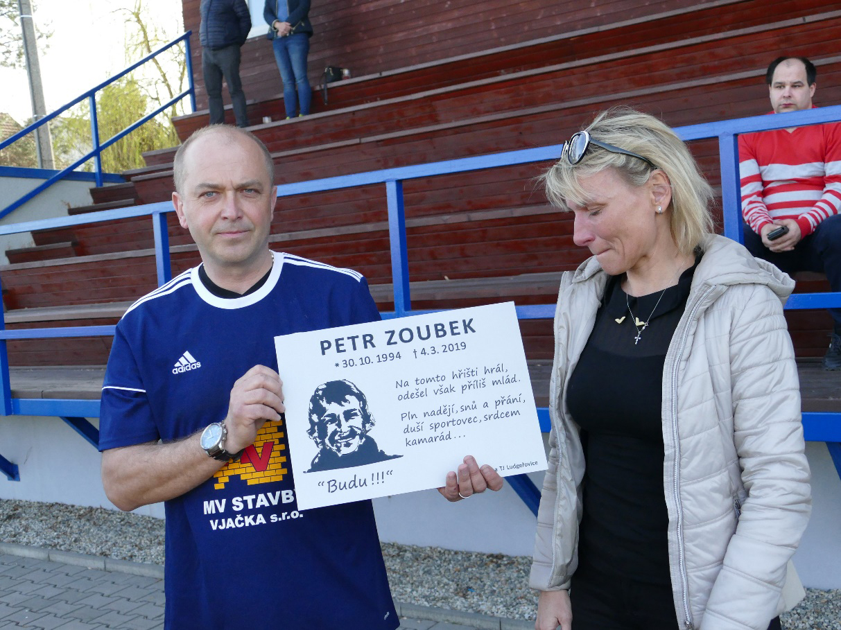 Před zahájením utkání ještě všichni na hřišti i v hledišti uctili památku zesnulého hráče mužstva TJ, čtyřiadvacetiletého Petra Zoubka, který 4. 3. 2019 zemřel po krátké těžké nemoci. Starosta naší obce Daniel Havlík předal rodičům hráče pamětní plaketu, která bude umístěna na tribuně. Jeho dres s číslem 16 pak zůstane vyvěšen na chodbě u domácí šatny mužů a toto číslo na dresu již mužstvo nebude dále používat.