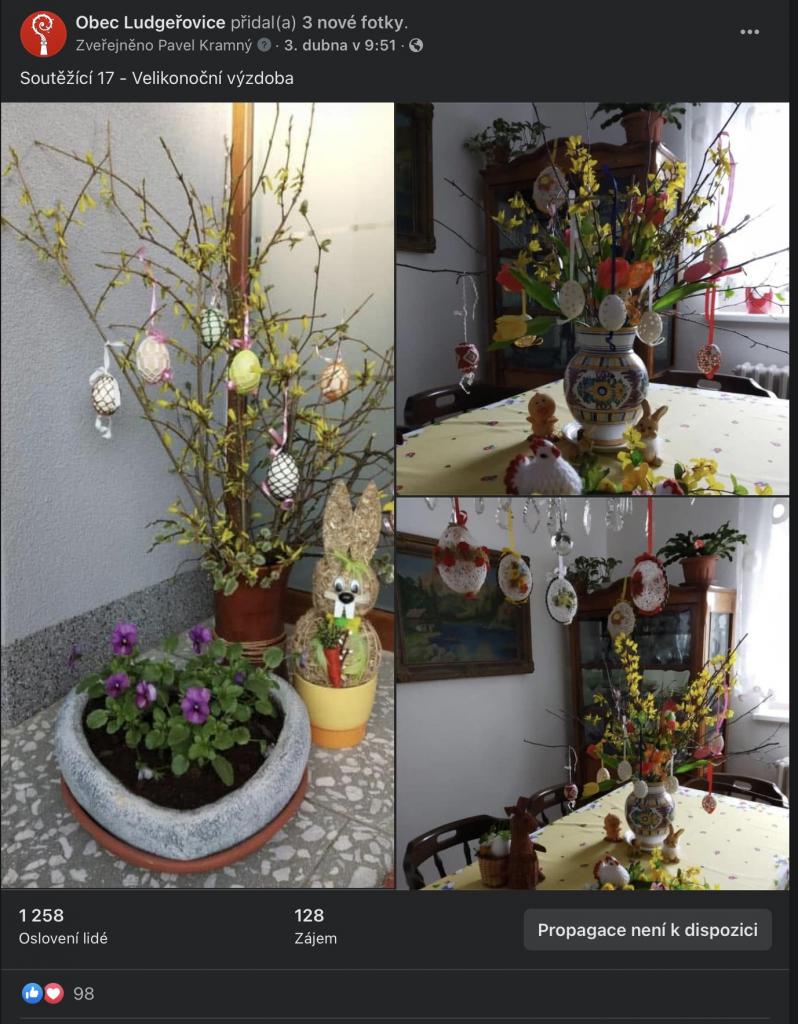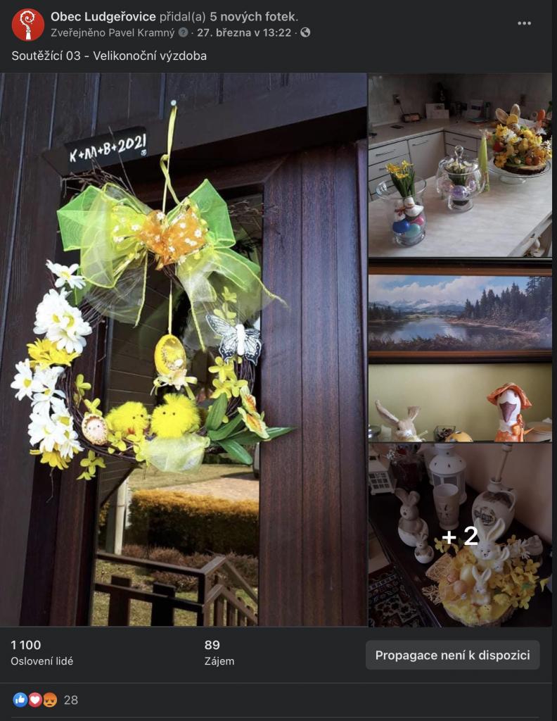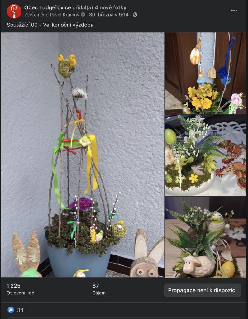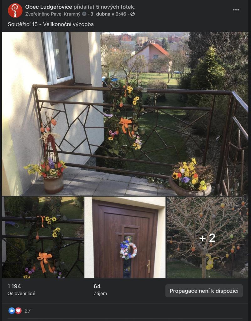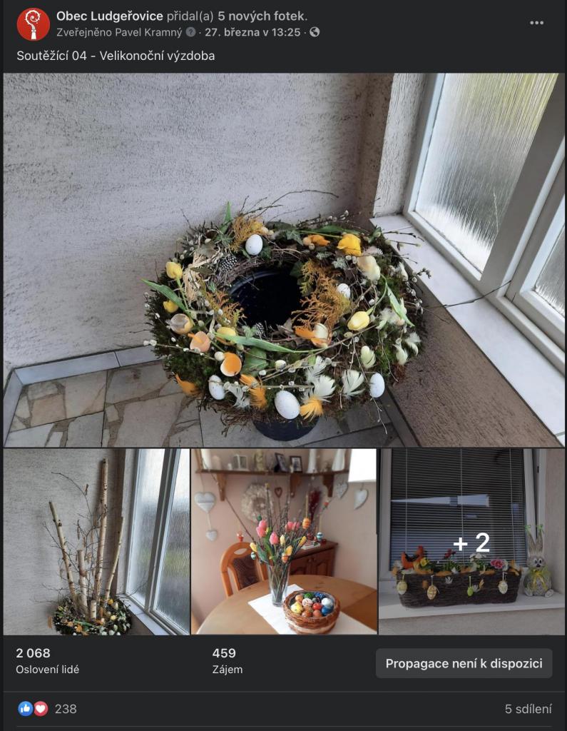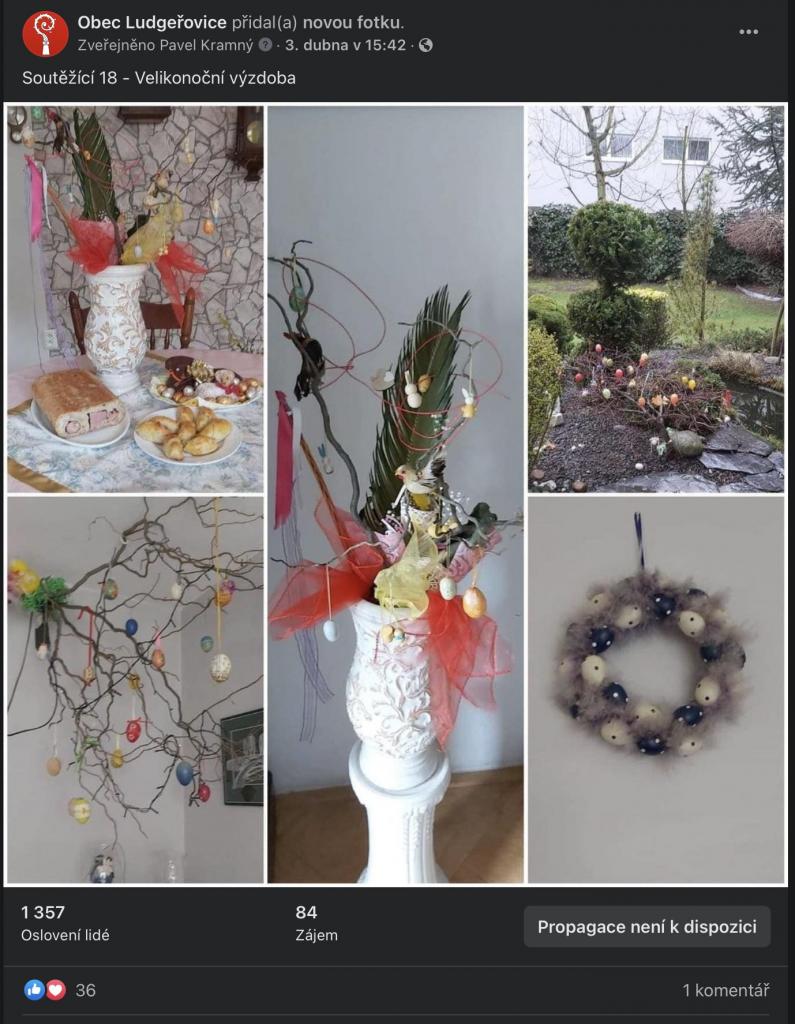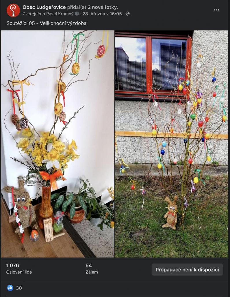Na stránkách obce, na facebookové stránce Obec Ludgeřovice, ve vývěskách i ve Zpravodaji jsme Vás informovali o facebookové Soutěži o nejkrásnější velikonoční výzdobu, kterou jsme Vám chtěli zpříjemnit těšení se na svátky jara, které letos už podruhé ovlivnila ta všude přítomná pandemie.