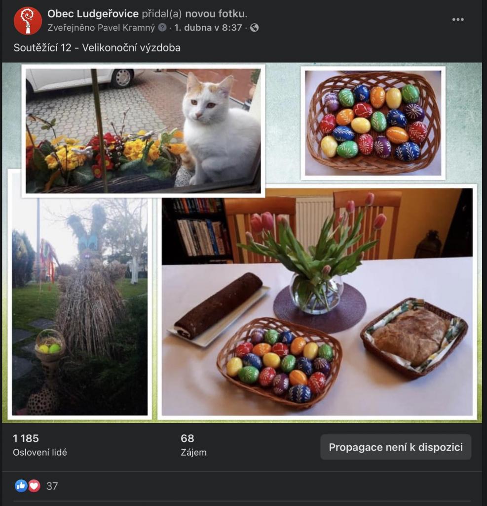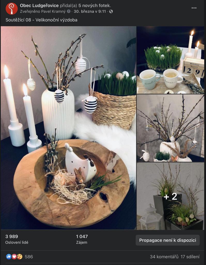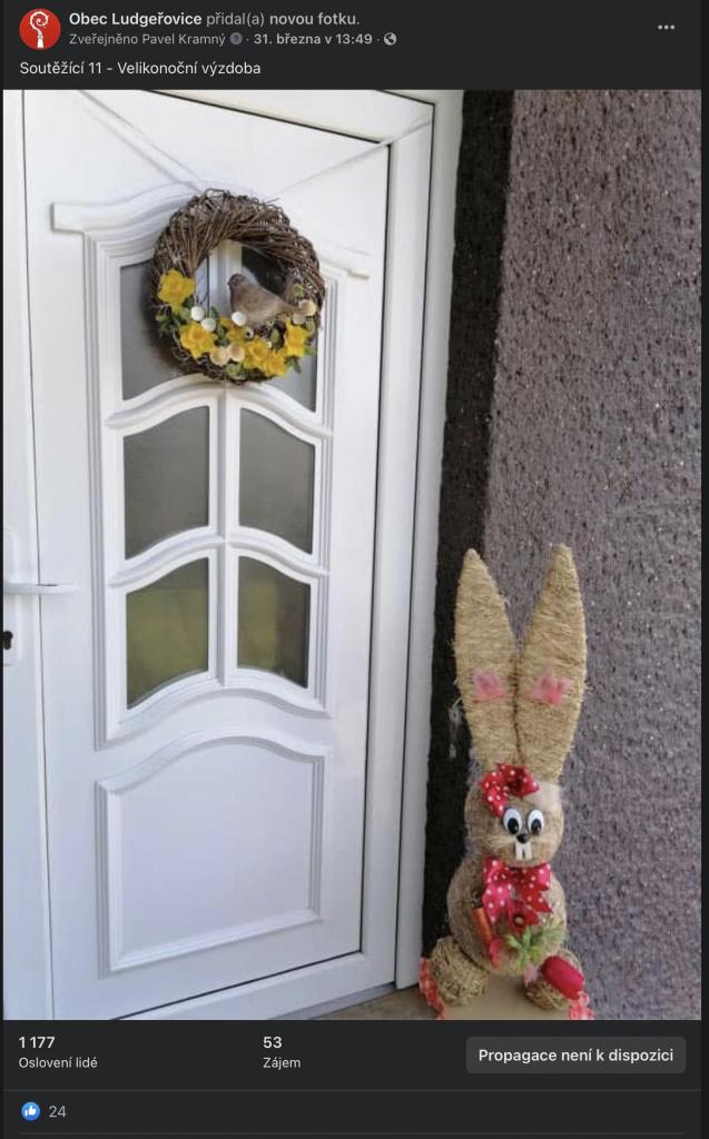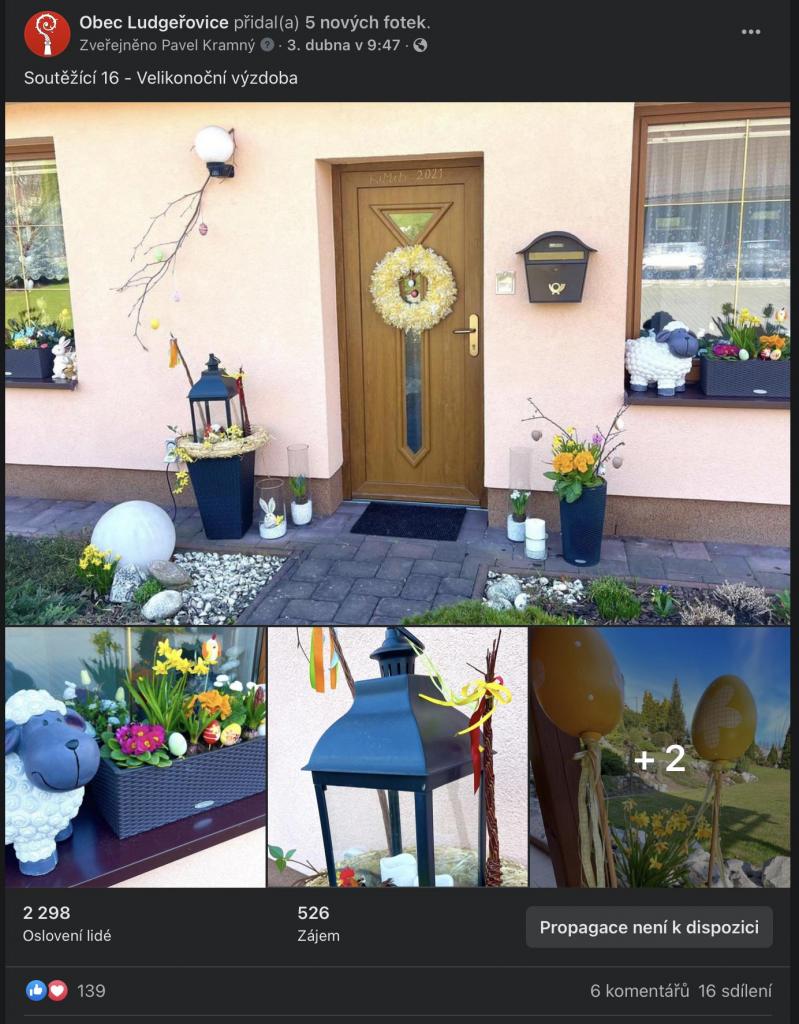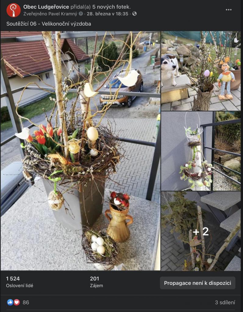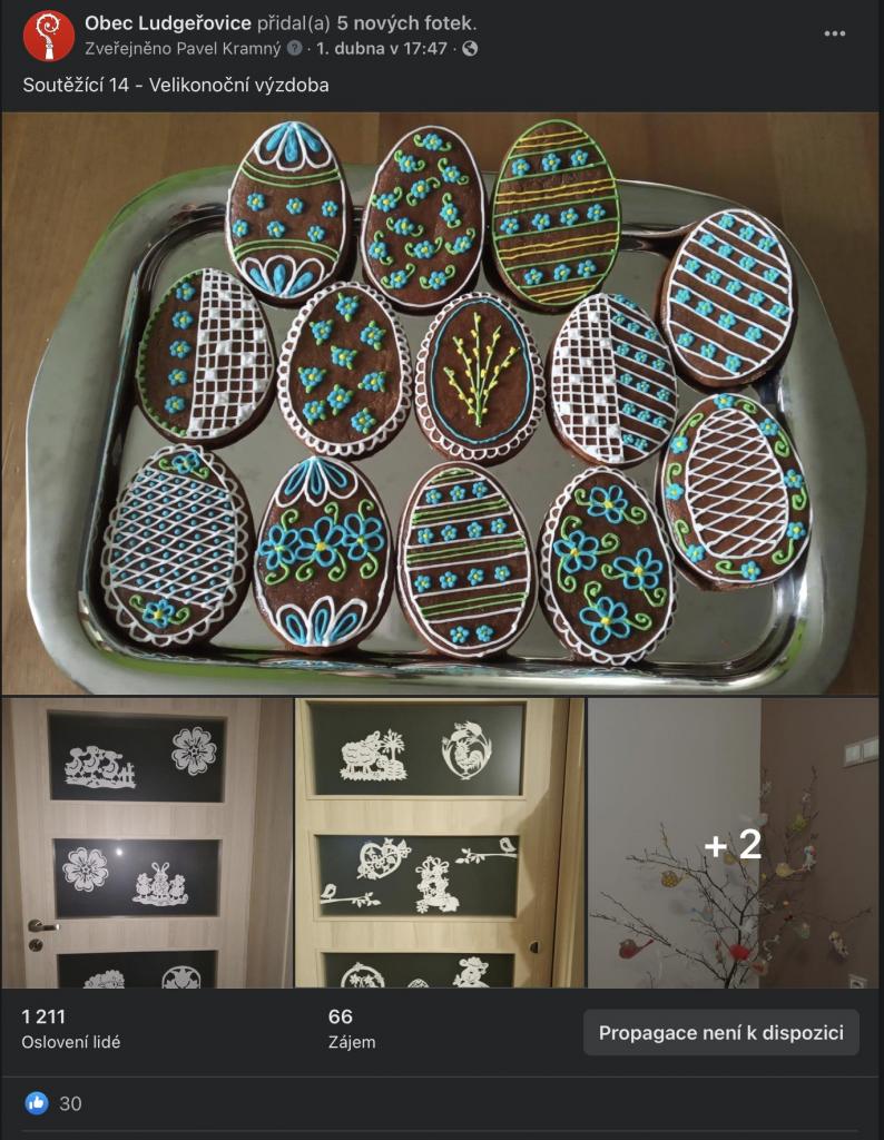Na stránkách obce, na facebookové stránce Obec Ludgeřovice, ve vývěskách i ve Zpravodaji jsme Vás informovali o facebookové Soutěži o nejkrásnější velikonoční výzdobu, kterou jsme Vám chtěli zpříjemnit těšení se na svátky jara, které letos už podruhé ovlivnila ta všude přítomná pandemie.