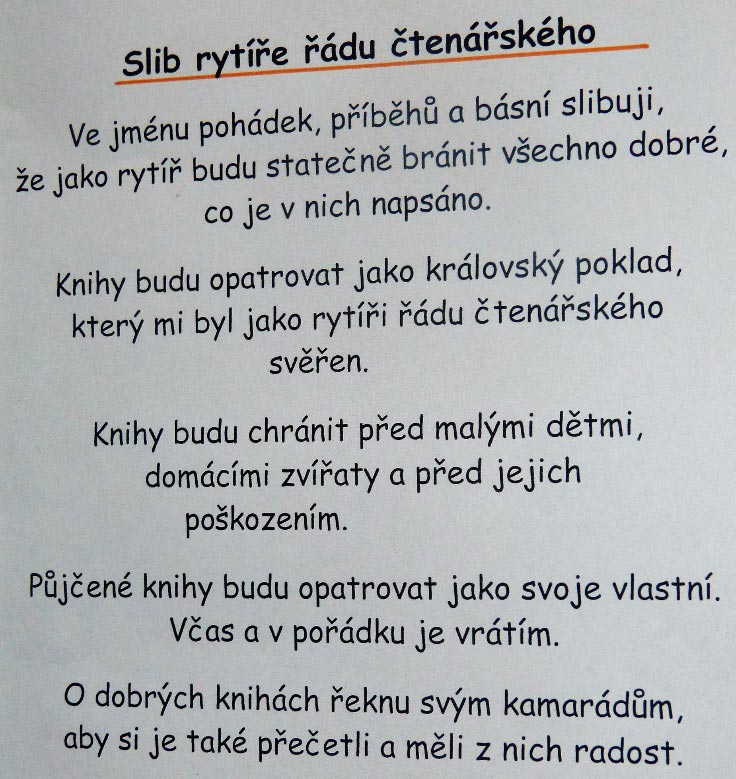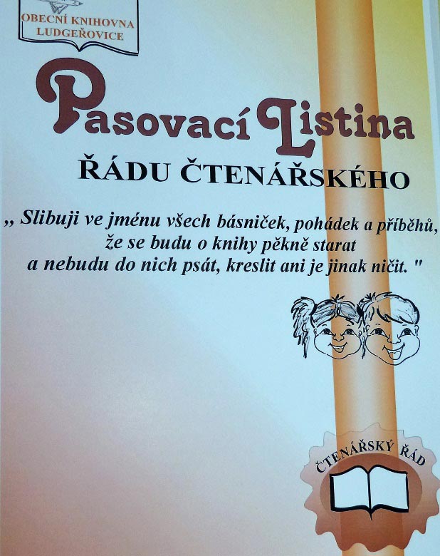 Slavnost pasování se tradičně už řadu let koná v obecní knihovně, letos 22. září. Dostavilo se k němu 28 žáků z obou současných druhých tříd ludgeřovické základní školy ( z hlavní budovy i z Dolní školy) i s jejich učitelkami Mgr. Michaelou Kryglerovou a Mgr. Alenou Rajnochovou. Pasování provedl starosta obce Mgr. Daniel Havlík ve spolupráci s knihovnicí Janou Baránkovou. Starosta Jako „rytíř knihomol“, knihovnice jako „královna pohádek“, oba v příslušném oblečení. Žáci museli prokázat, že číst umí, a to tak, že každý přečetl jednu větu z knihy pohádek. Všichni v této zkoušce uspěli a pasování mohlo začít. Jednotlivě pak přestupovali před „rytíře knihomola“, rukoudáním vykonali „slib rytíře řádu čtenářského“, poklekli a „rytíř knihomol“ každého poklepem pasovacím mečem pasoval na „člena řádu čtenářského“. „Královna pohádek“ pak každému předala pasovací listinu a jako dárek knihu pohádek. Nakonec se všichni společně fotografovali. Byla to moc hezká slavnost. A. Vjačka